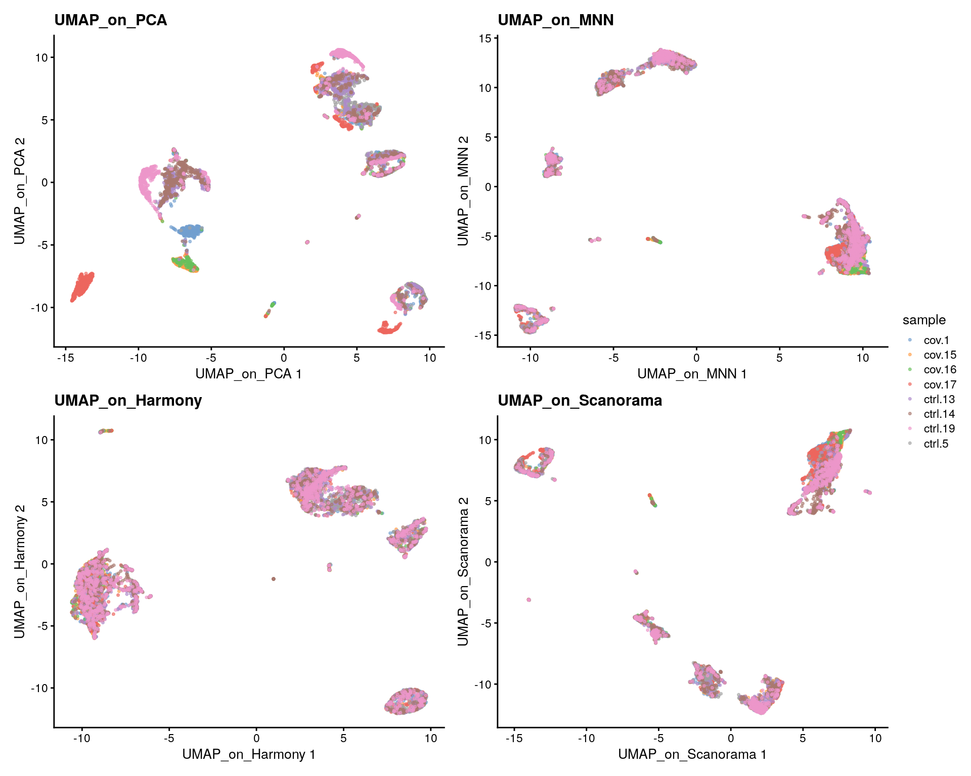 sce <-RunHarmony( sce,group.by.vars ="sample",reduction.save ="harmony",reduction ="PCA",dims.use =1:50)# Here we use all PCs computed from Harmony for UMAP calculationsce <-runUMAP(sce, dimred ="harmony", n_dimred =50, ncomponents =2, name ="UMAP_on_Harmony")