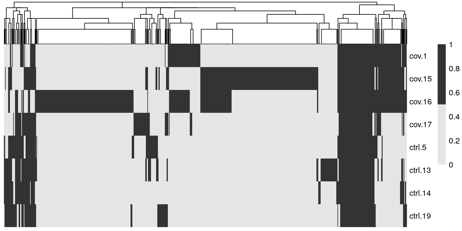pheatmap::pheatmap(t(overlap *1), cluster_rows = F, color =c("grey90", "grey20")) ## MNN