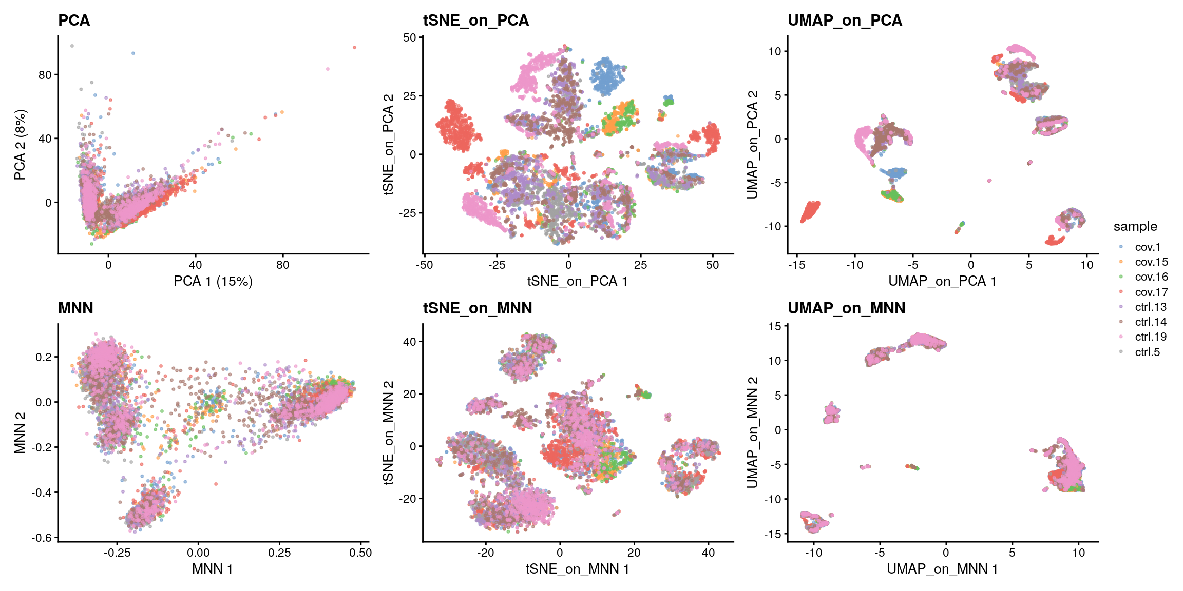 set.seed(42)sce <-runTSNE(sce, dimred ="MNN", n_dimred =50, perplexity =30, name ="tSNE_on_MNN")sce <-runUMAP(sce, dimred ="MNN", n_dimred =50, ncomponents =2, name ="UMAP_on_MNN")