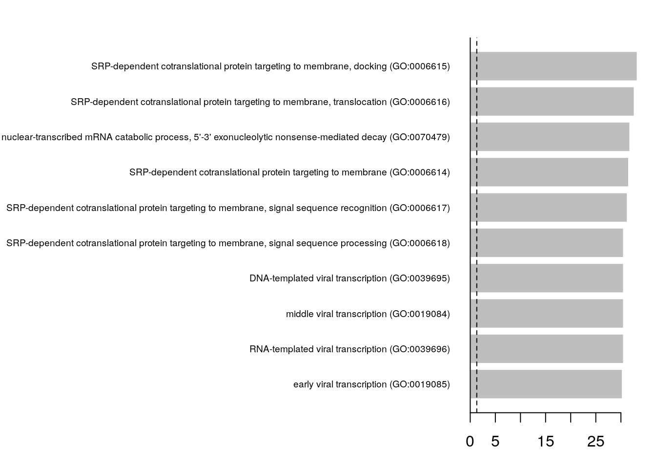 barplot(sort(setNames(-log10(top25$p.value), top25$gene)[top25$cluster == i], F),
