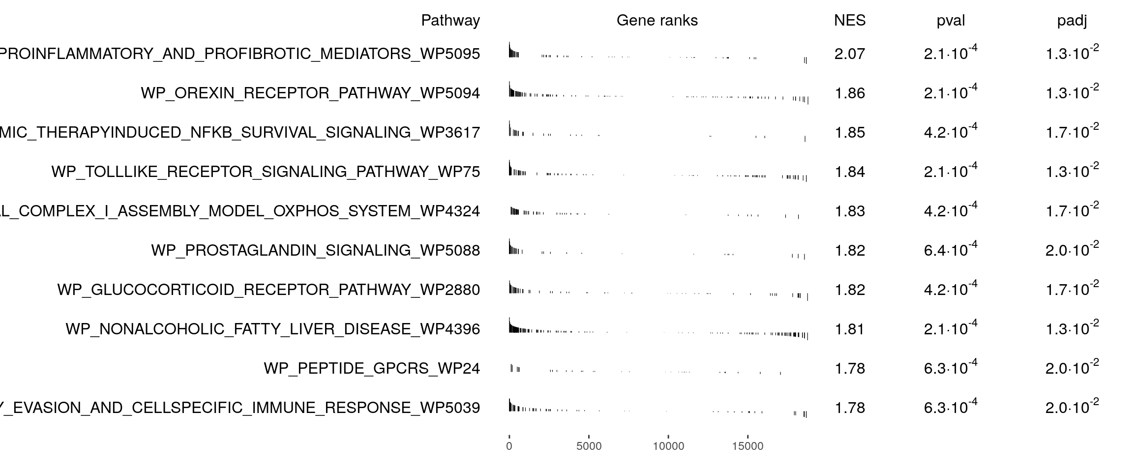 names(gmt) <- unique(paste0(msigdbgmt_subset$gs_name, "_", msigdbgmt_subset$gs_exact_source))Next, we will run GSEA. This will result in a table containing information for several pathways. We can then sort and filter those pathways to visualize only the top ones. You can select/filter them by either p-value or normalized enrichment score (NES).