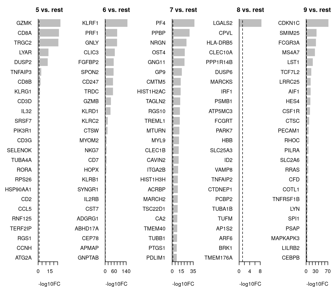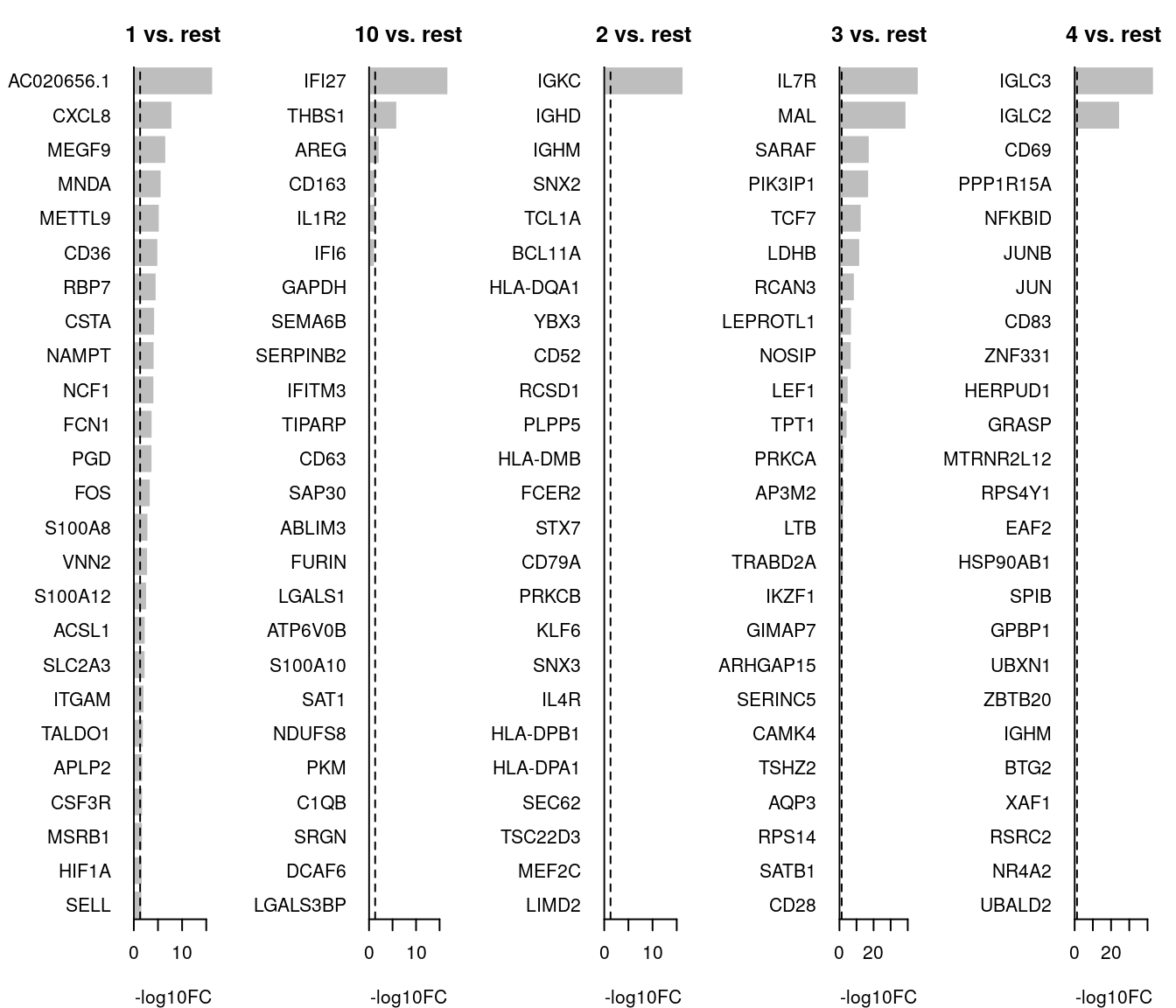 horiz = T, las = 1, main = paste0(i, " vs. rest"), border = "white", yaxs = "i", xlab = "-log10FC"