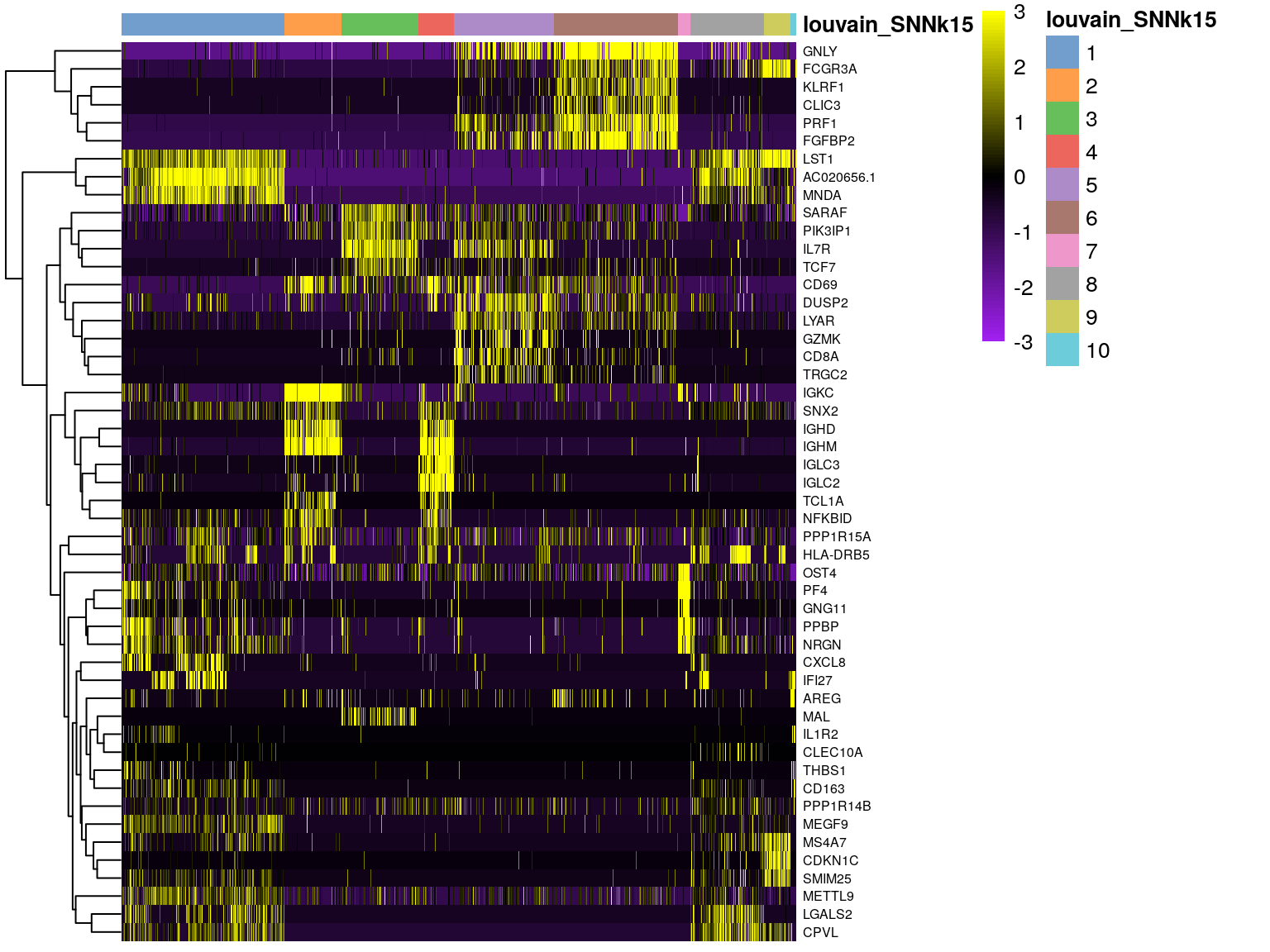 scater::plotHeatmap(sce[, order(sce$louvain_SNNk15)],