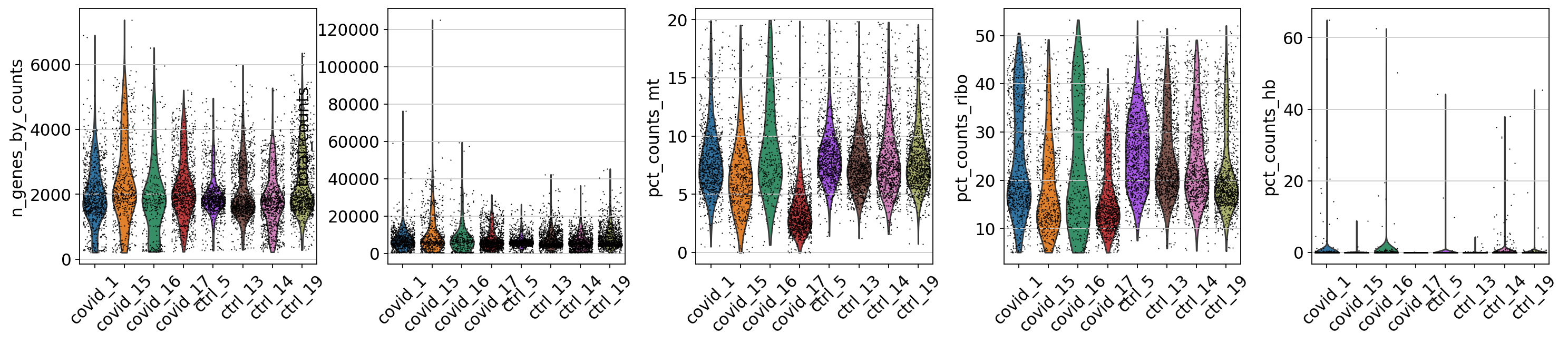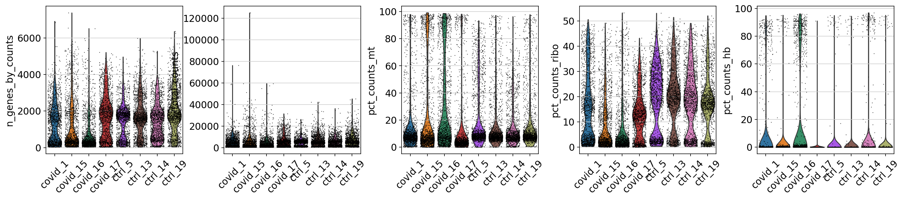 Having the data in a suitable format, we can start calculating some quality metrics. We can for example calculate the percentage of mitochondrial and ribosomal genes per cell and add to the metadata. The proportion of hemoglobin genes can give an indication of red blood cell contamination. This will be helpful to visualize them across different metadata parameters (i.e. datasetID and chemistry version). There are several ways of doing this. The QC metrics are finally added to the metadata table.