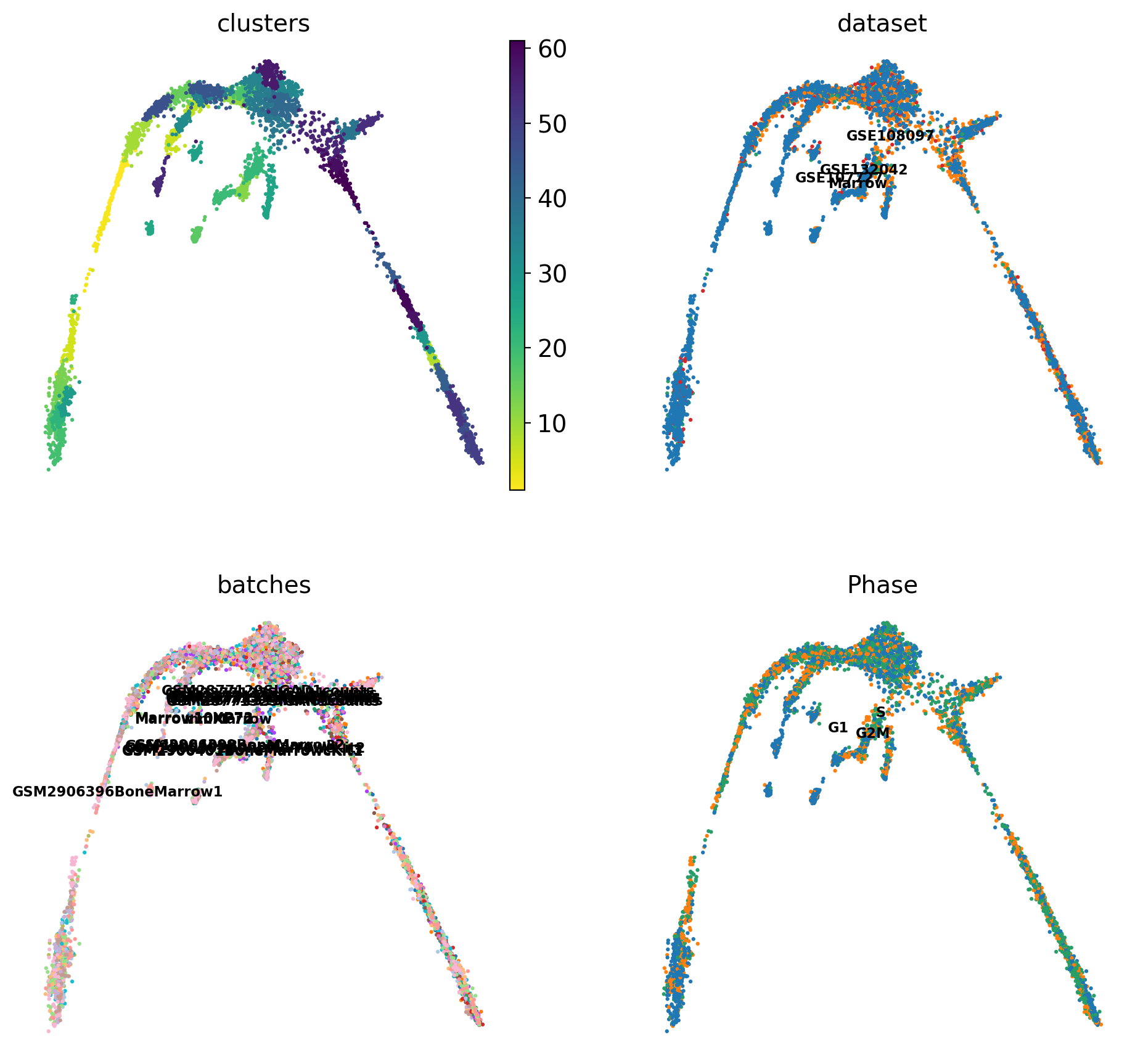 sc.pl.umap(adata, color = ['clusters','dataset','batches','Phase'],legend_loc = 'on data', legend_fontsize = 'xx-small', ncols = 2)It is crucial that you performing analysis of a dataset understands what is going on, what are the clusters you see in your data and most importantly How are the clusters related to each other?. Well, let’s explore the data a bit. With the help of this table, write down which cluster numbers in your dataset express these key markers.
