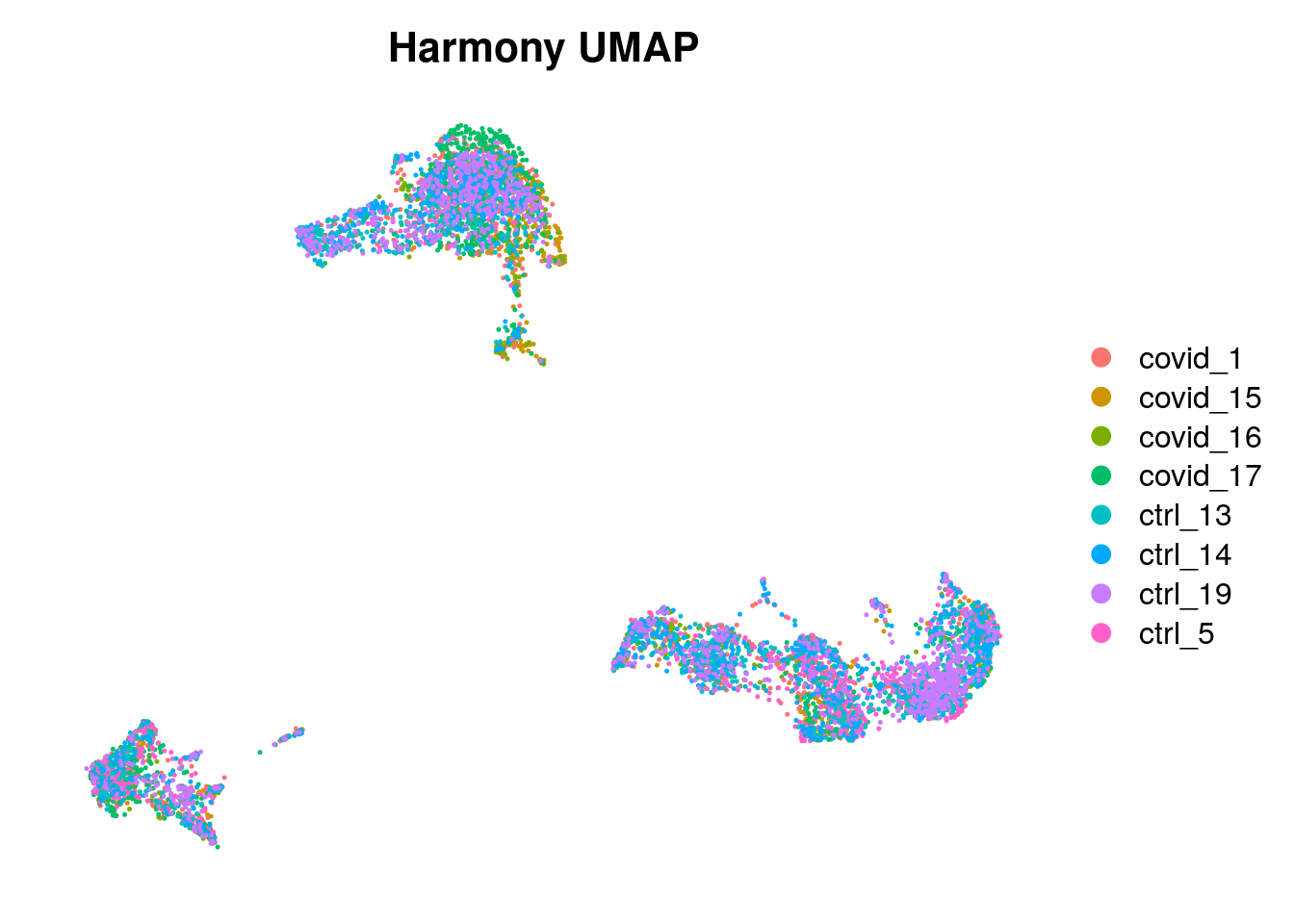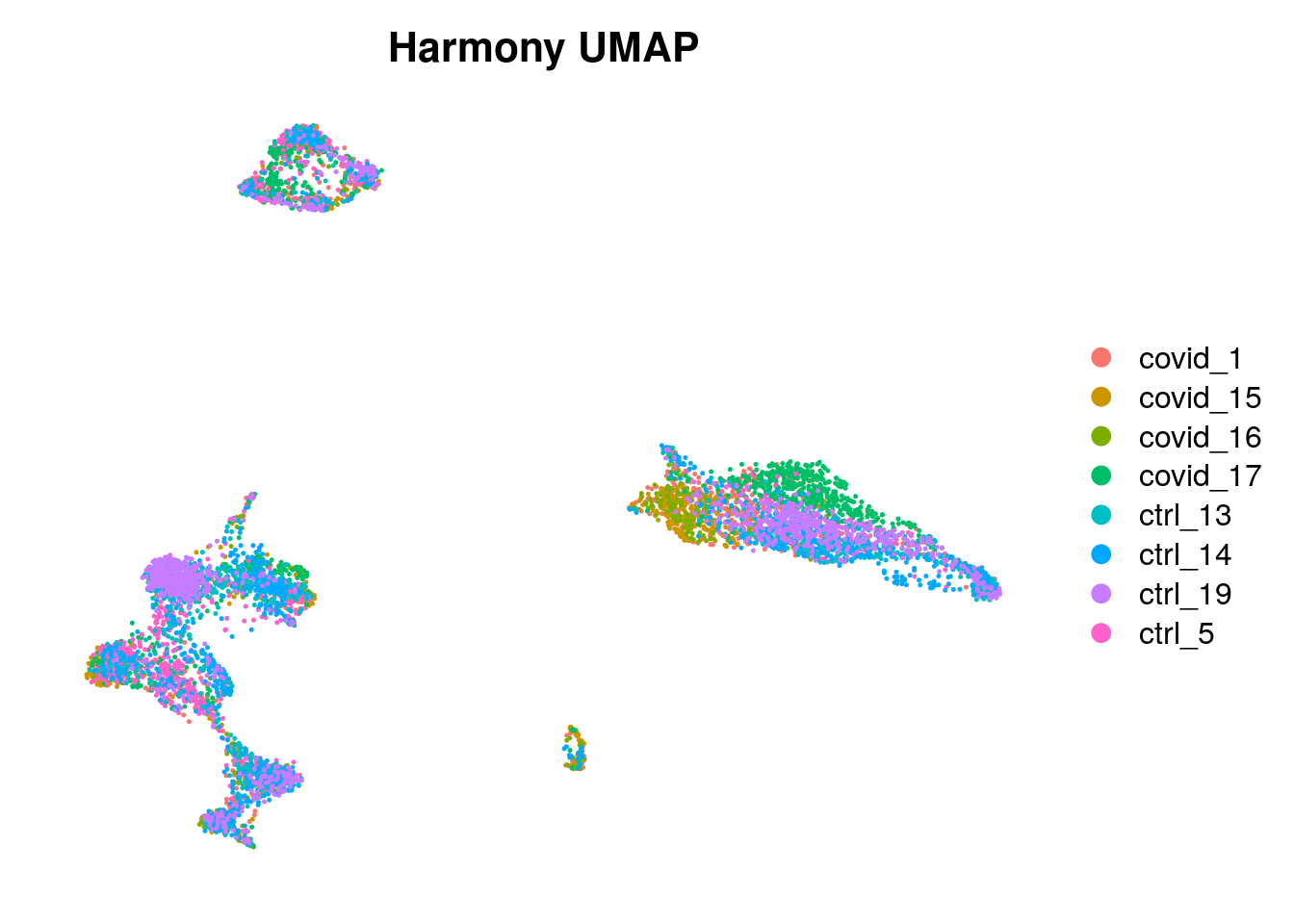 #Here we use all PCs computed from Scanorama for UMAP calculationalldata.int <-RunUMAP(alldata.int, dims =1:100, reduction ="scanorama",reduction.name ="umap_scanorama")DimPlot(alldata.int, reduction ="umap_scanorama", group.by ="orig.ident") +NoAxes() +ggtitle("Harmony UMAP")