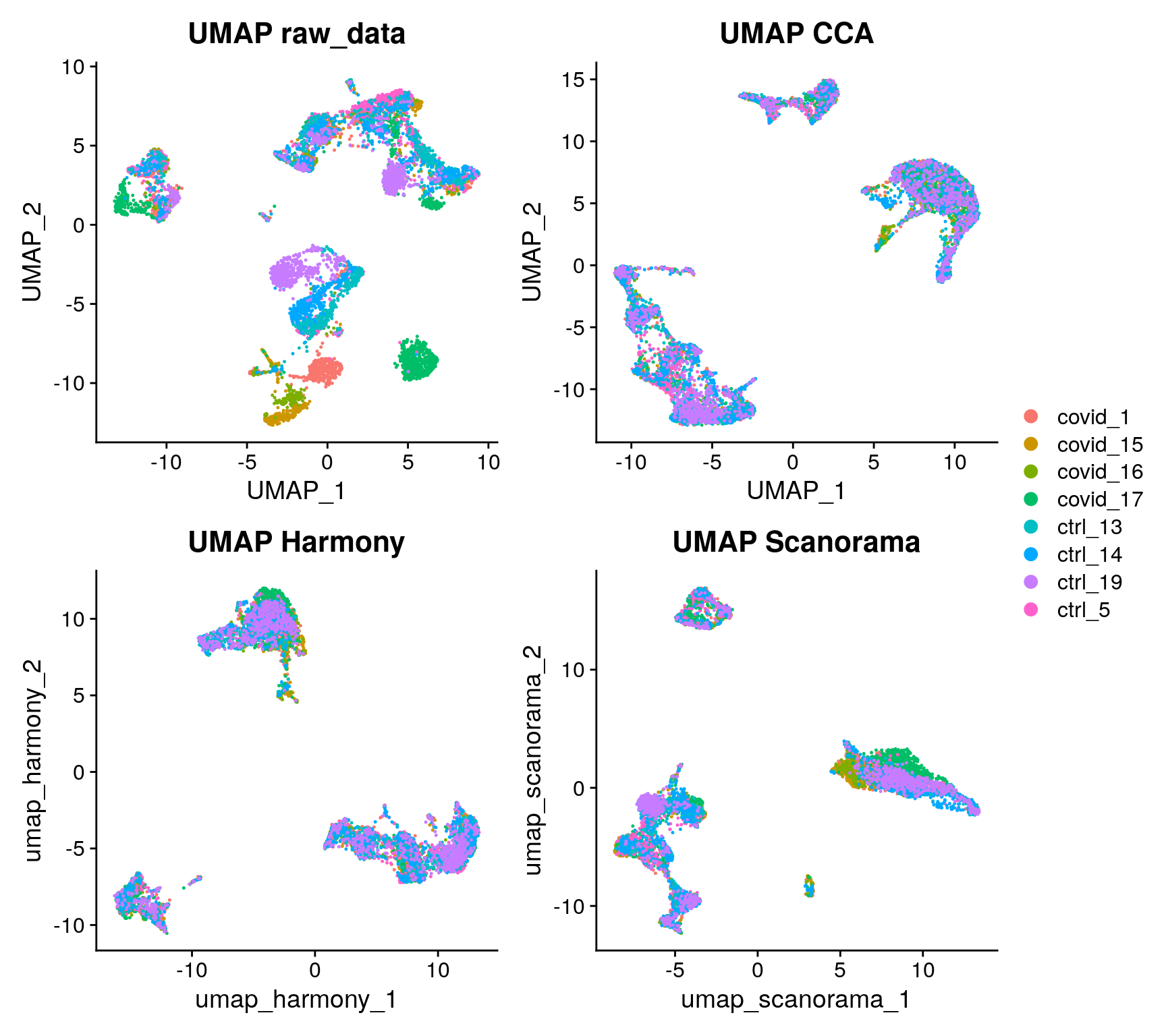 Another integration method is Scanorama (see Nat. Biotech.). This method is implemented in python, but we can run it through the Reticulate package.