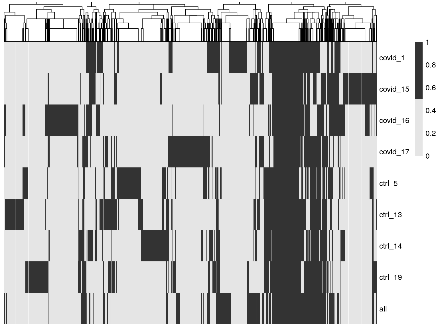alldata.list <-SplitObject(alldata, split.by ="orig.ident")for (i in1:length(alldata.list)) { alldata.list[[i]] <-NormalizeData(alldata.list[[i]], verbose =FALSE) alldata.list[[i]] <-FindVariableFeatures(alldata.list[[i]], selection.method ="vst", nfeatures =2000,verbose =FALSE)}# get the variable genes from all the datasets.hvgs_per_dataset <-lapply(alldata.list, function(x) { x@assays$RNA@var.features })# also add in the variable genes that was selected on the whole datasethvgs_per_dataset$all =VariableFeatures(alldata)temp <-unique(unlist(hvgs_per_dataset))overlap <-sapply( hvgs_per_dataset , function(x) { temp %in% x } )pheatmap::pheatmap(t(overlap*1),cluster_rows = F ,color =c("grey90","grey20"))