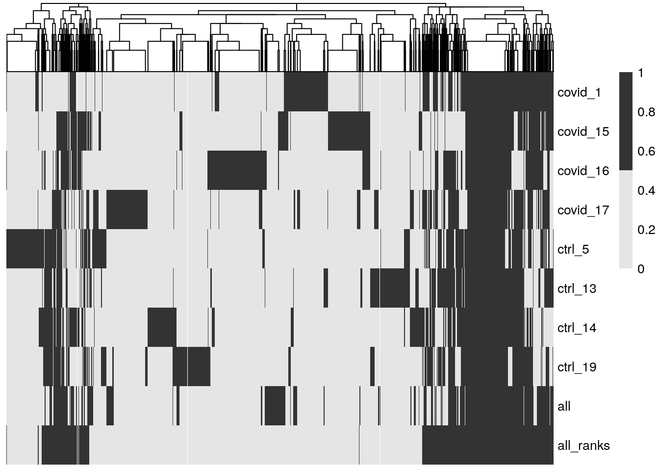 hvgs_all =SelectIntegrationFeatures(alldata.list)hvgs_per_dataset$all_ranks = hvgs_alltemp <-unique(unlist(hvgs_per_dataset))overlap <-sapply( hvgs_per_dataset , function(x) { temp %in% x } )pheatmap::pheatmap(t(overlap*1),cluster_rows = F ,color =c("grey90","grey20"))