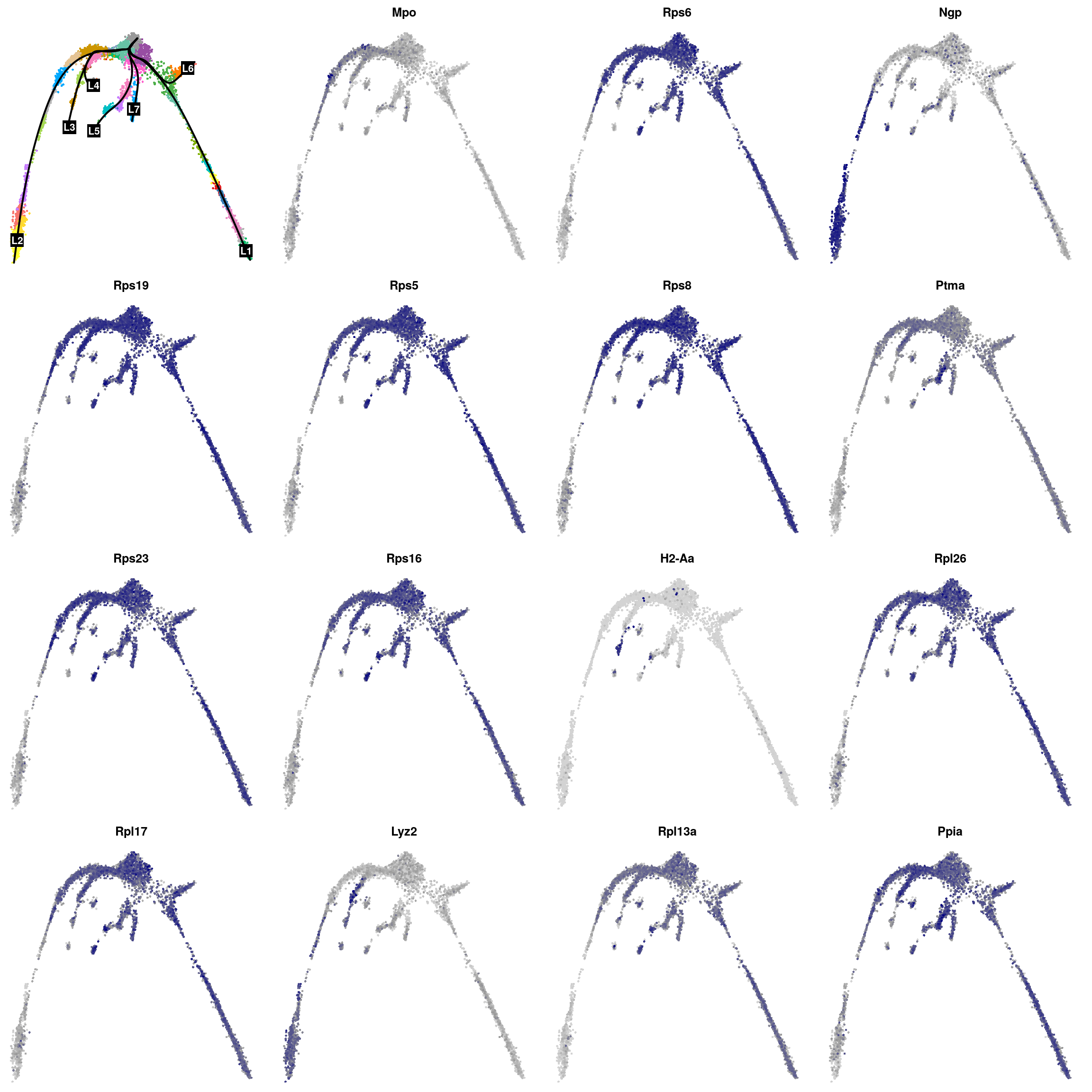 vars <- c("Cd34", "Ms4a1", "Cd3e", "Ltf", "Cst3", "Mcpt8", "Alas2", "Siglech", "C1qc", "Pf4")