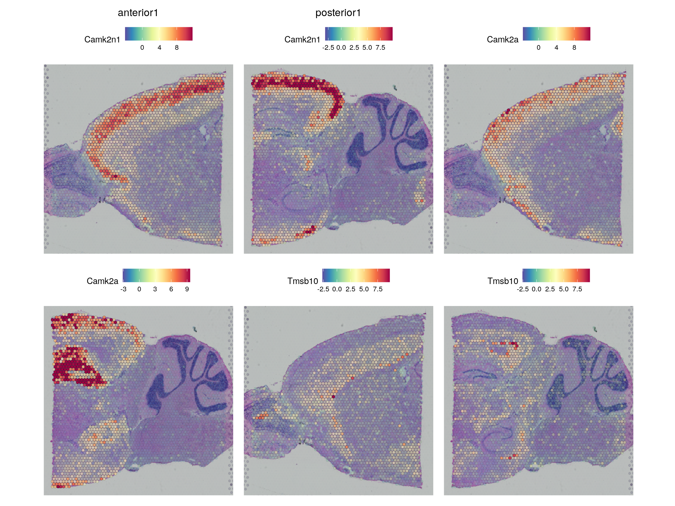 brain <- SCTransform(brain, assay = "Spatial", method = "poisson", verbose = TRUE)Now we can plot gene expression of individual genes, the gene Hpca is a strong hippocampal marker and Ttr is a marker of the choroid plexus.
