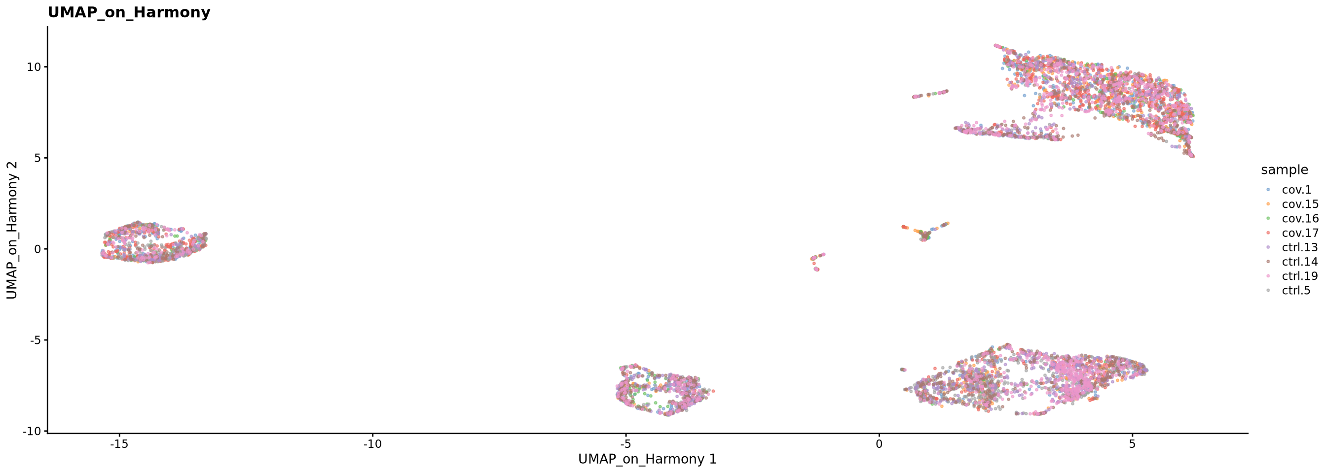 p3 <- plotReducedDim(sce, dimred = "UMAP_on_Harmony", colour_by = "sample", point_size = 0.6) + ggplot2::ggtitle(label = "UMAP_on_Harmony")