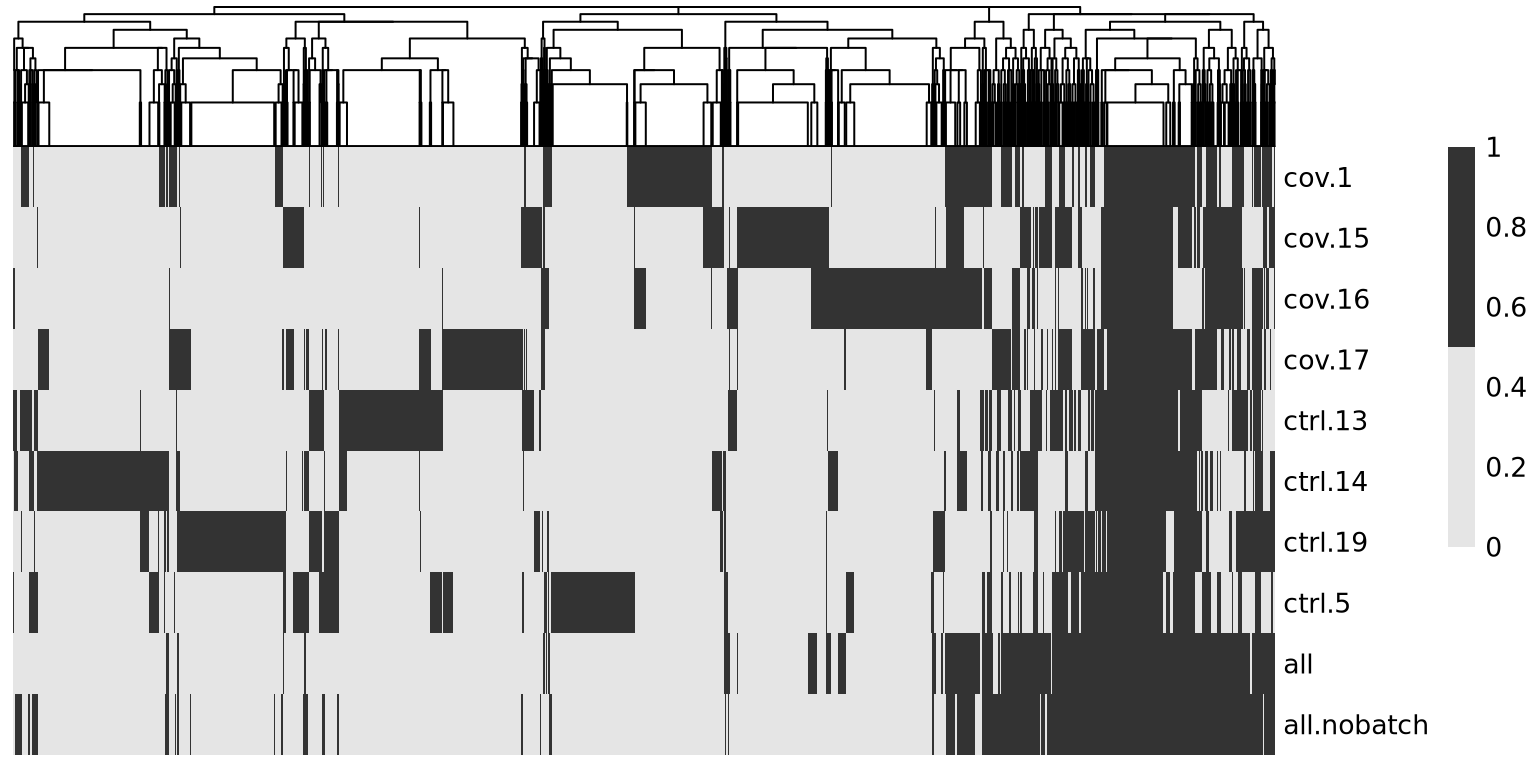 })As you can see, there are a lot of genes that are variable in just one dataset. There are also some genes in the gene set that was selected using all the data without blocking samples, that are not variable in any of the individual datasets. These are most likely genes driven by batch effects.