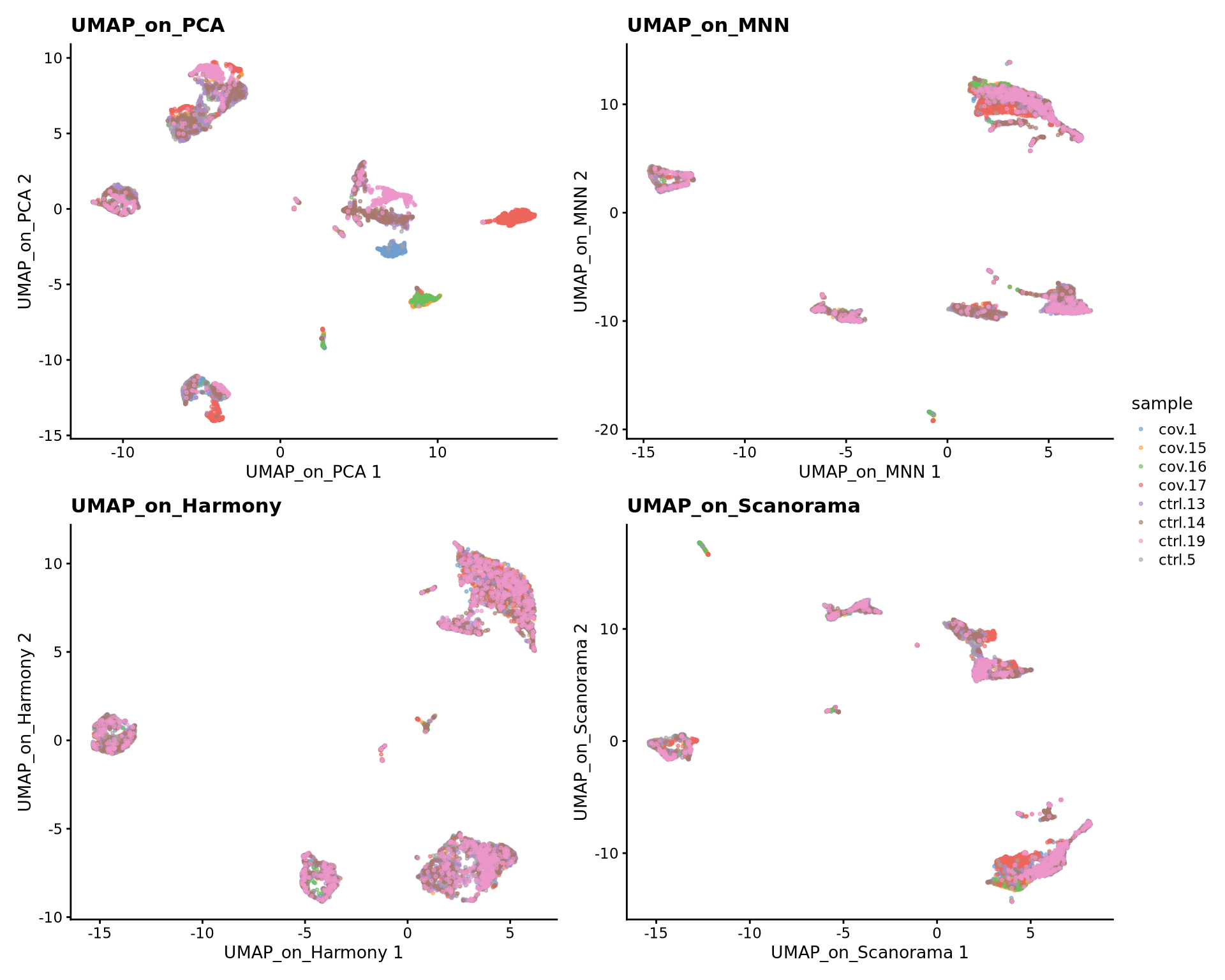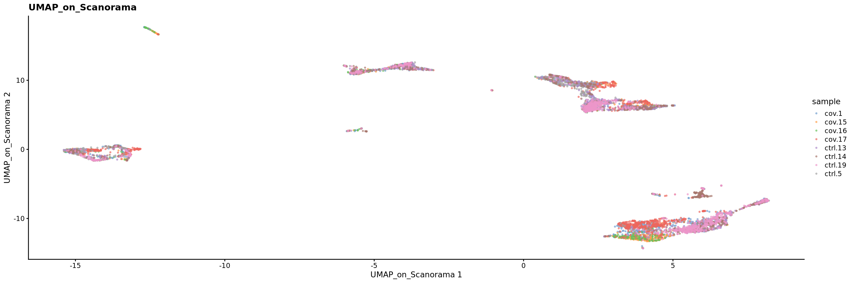 sce <- runUMAP(sce, dimred = "Scanorama", n_dimred = 50, ncomponents = 2, name = "UMAP_on_Scanorama")