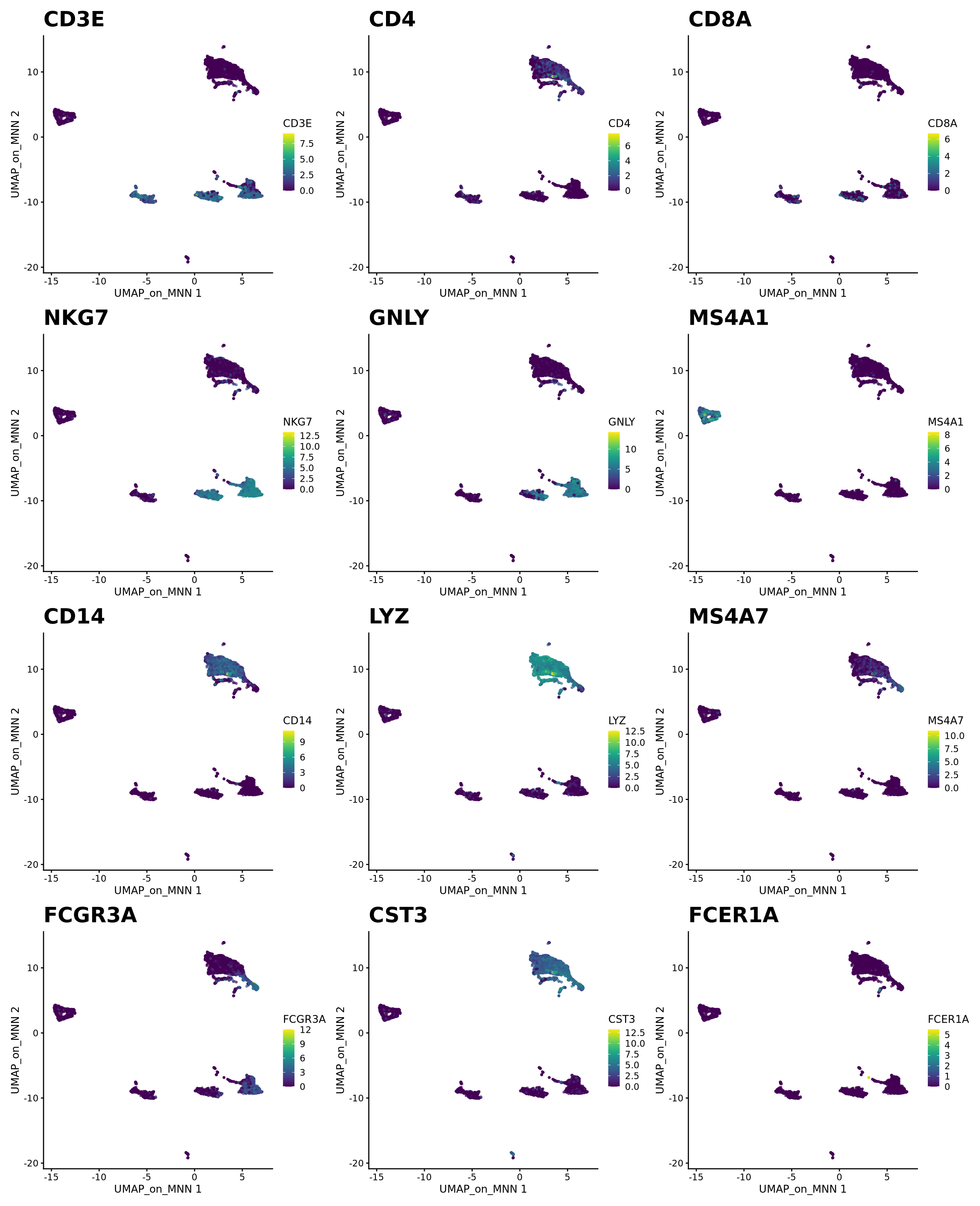 for (i in c("CD3E", "CD4", "CD8A", "NKG7", "GNLY", "MS4A1", "CD14", "LYZ", "MS4A7", "FCGR3A", "CST3", "FCER1A")) {