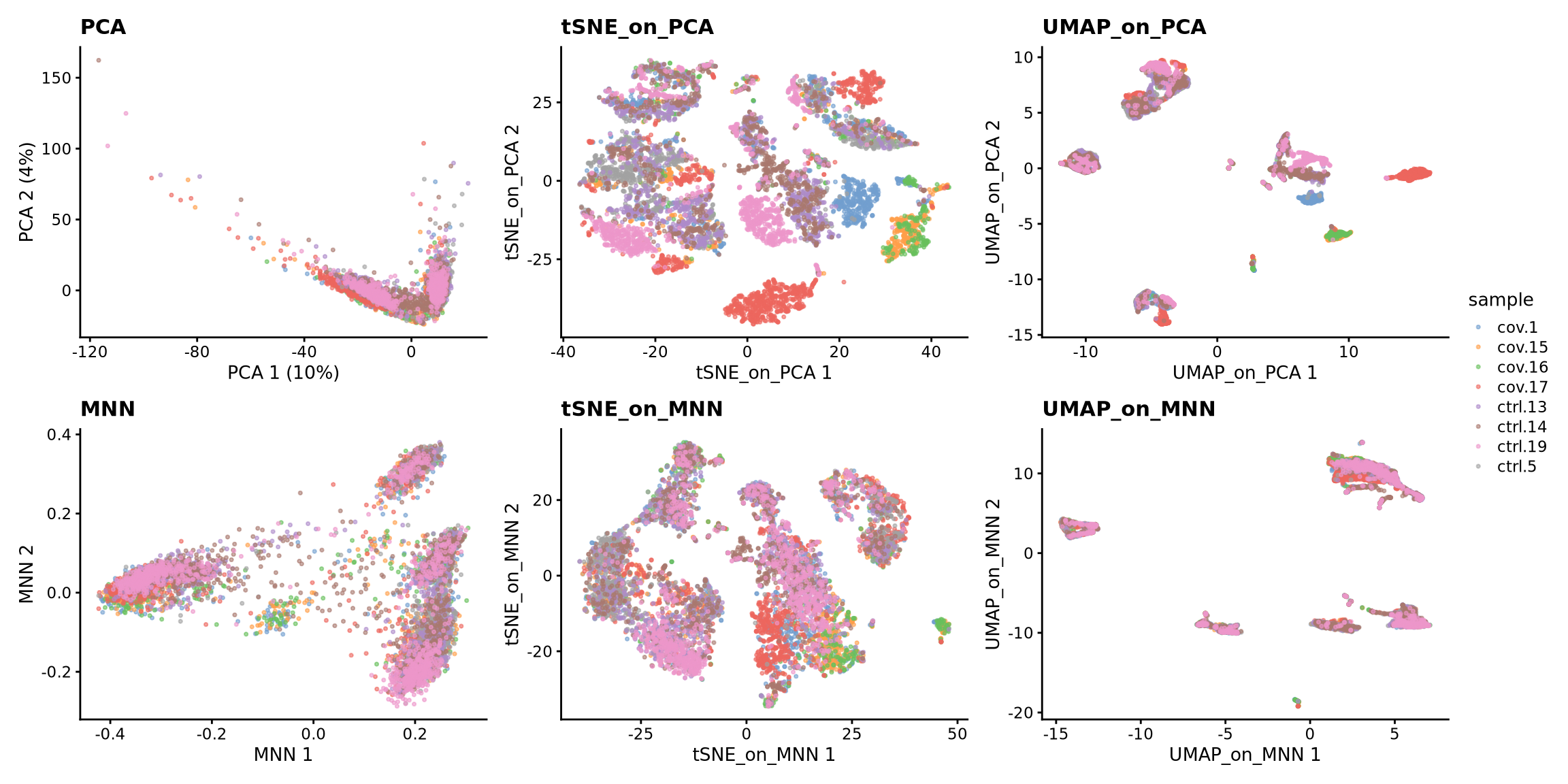 plotReducedDim(sce, dimred = "MNN", colour_by = "sample", point_size = 0.6) + ggplot2::ggtitle(label = "MNN"),