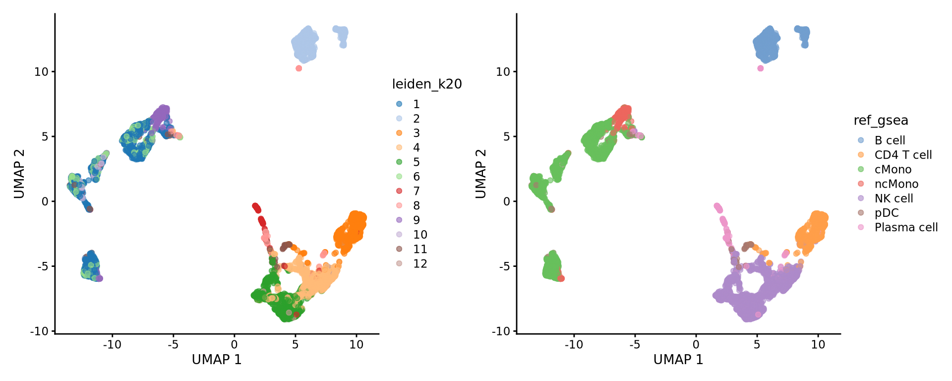 ref.sce <- runUMAP(ref.sce, dimred = "PCA")Run all steps of the analysis for the ctrl sample as well. Use the clustering from the integration lab with resolution 0.5.