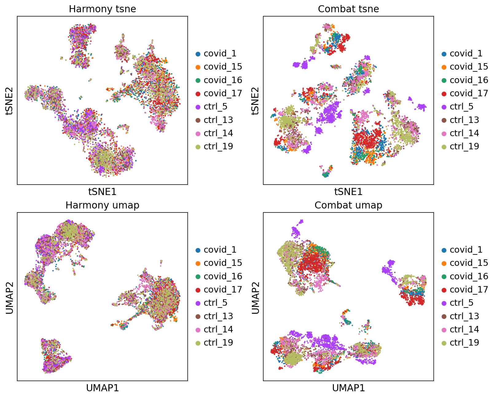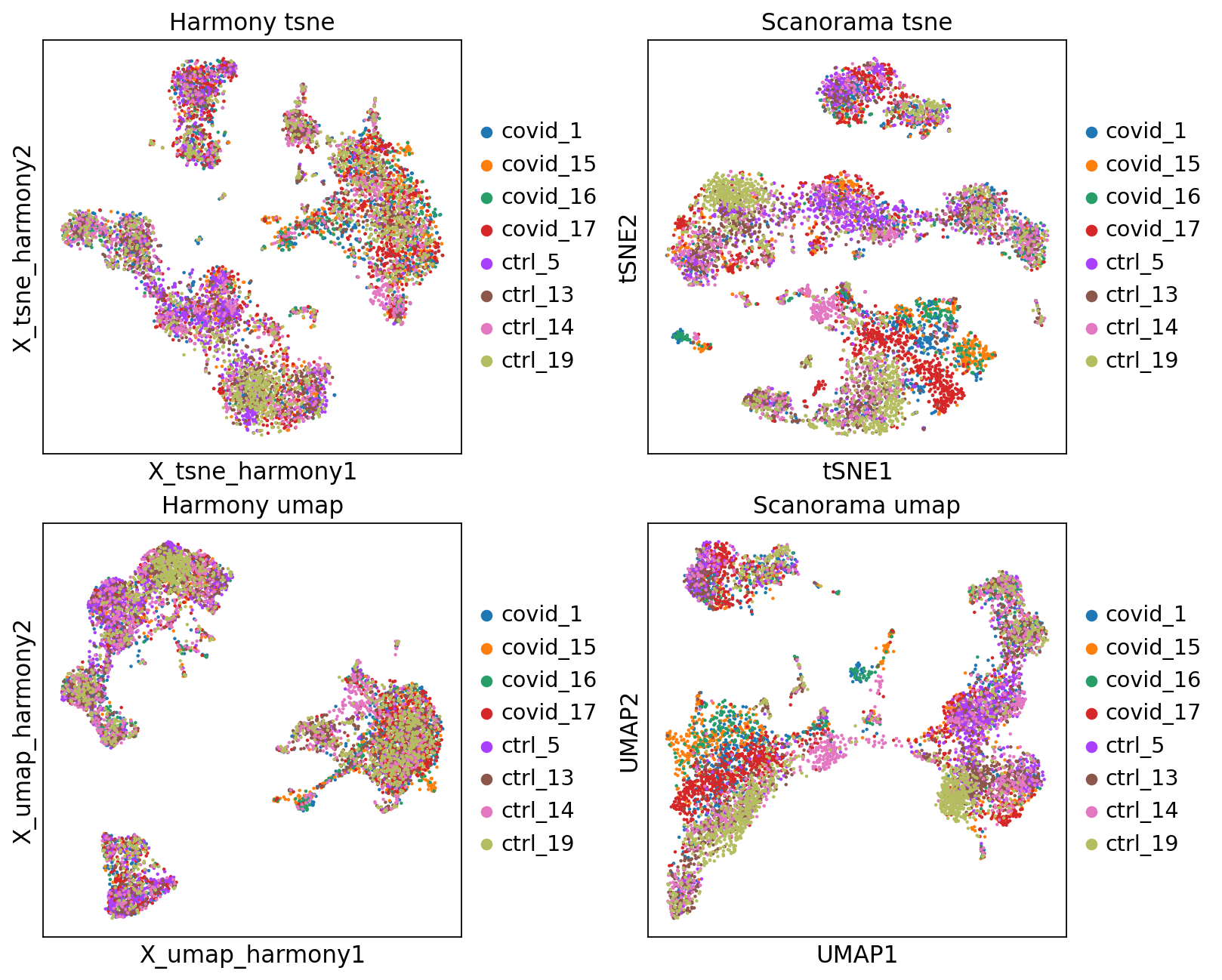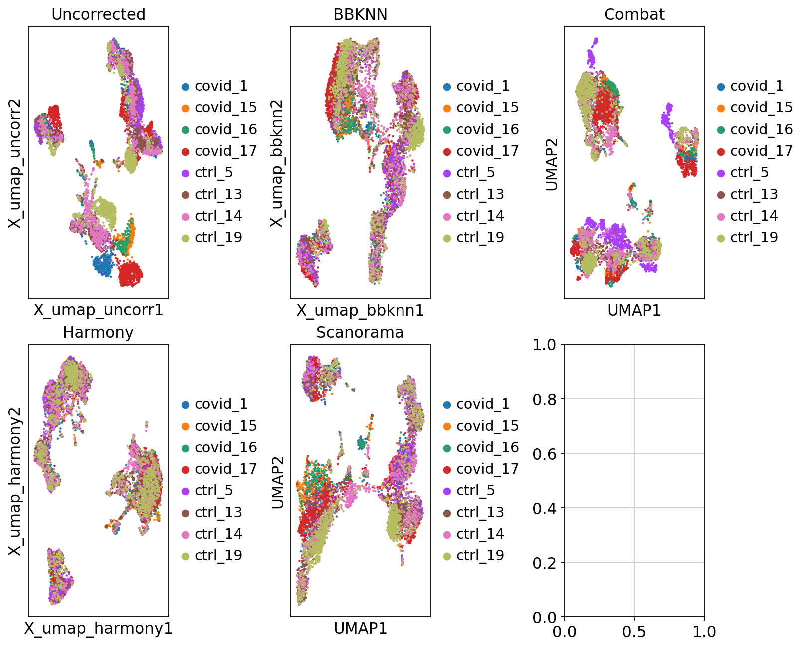 sc.pl.umap(adata, color="sample", title="Scanorama", ax=axs[1,1], show=False)<Axes: title={'center': 'Scanorama'}, xlabel='UMAP1', ylabel='UMAP2'>