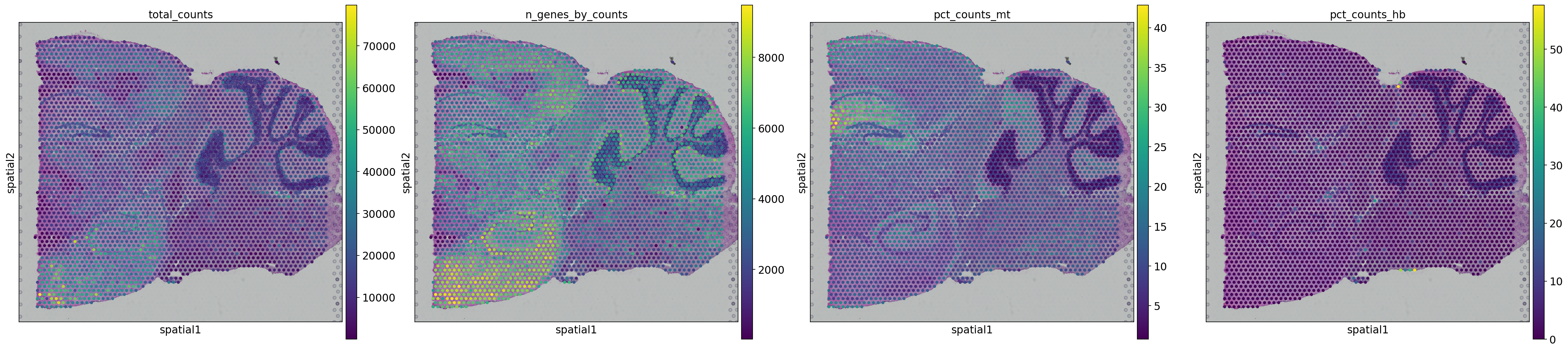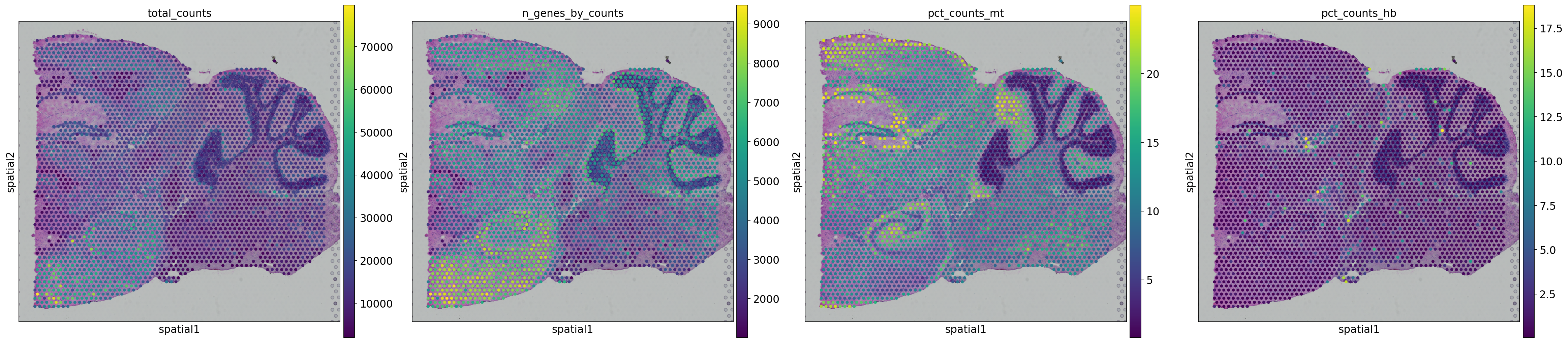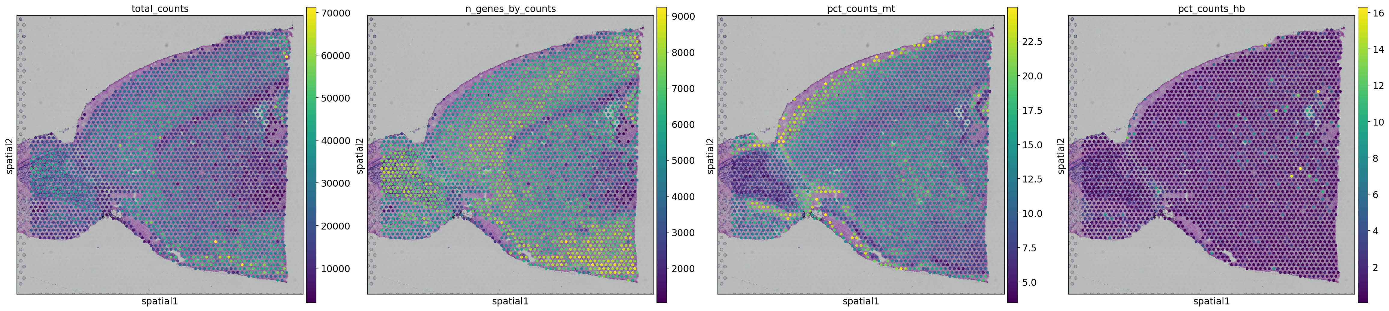 sc.pl.spatial(adata[adata.obs.library_id == library,:], library_id=library, color = ["total_counts", "n_genes_by_counts",'pct_counts_mt', 'pct_counts_hb'])As you can see, the spots with low number of counts/features and high mitochondrial content are mainly towards the edges of the tissue. It is quite likely that these regions are damaged tissue. You may also see regions within a tissue with low quality if you have tears or folds in your section.