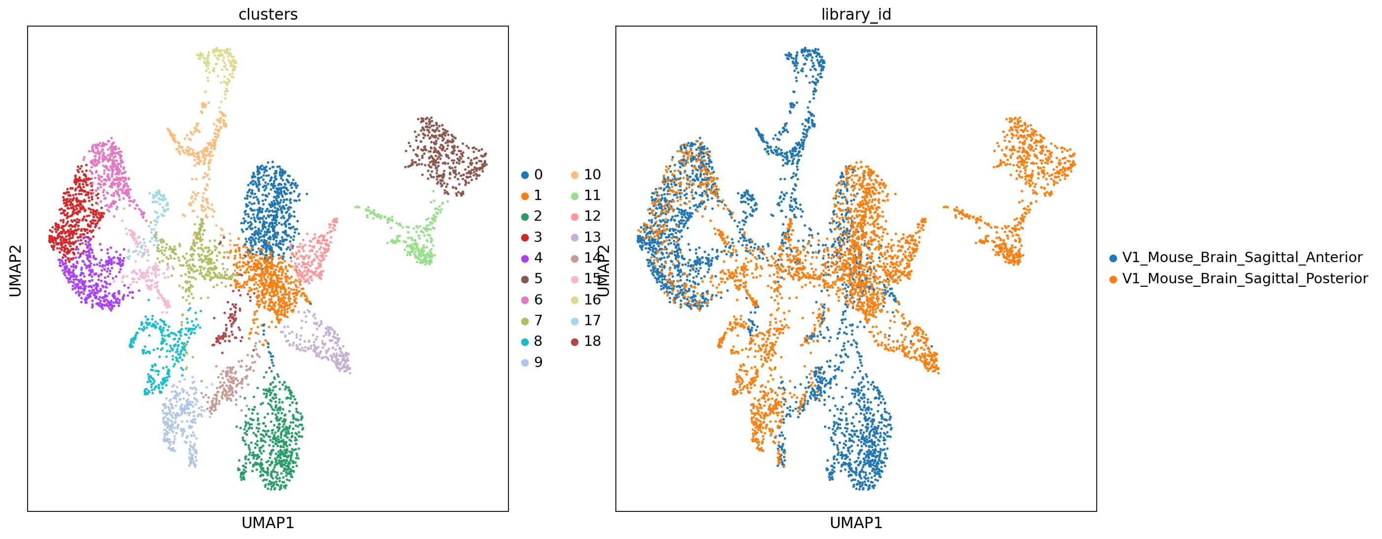 As we have two sections, we will select variable genes with batch_key=“library_id” and then take the union of variable genes for further analysis. The idea is to avoid including batch specific genes in the analysis.