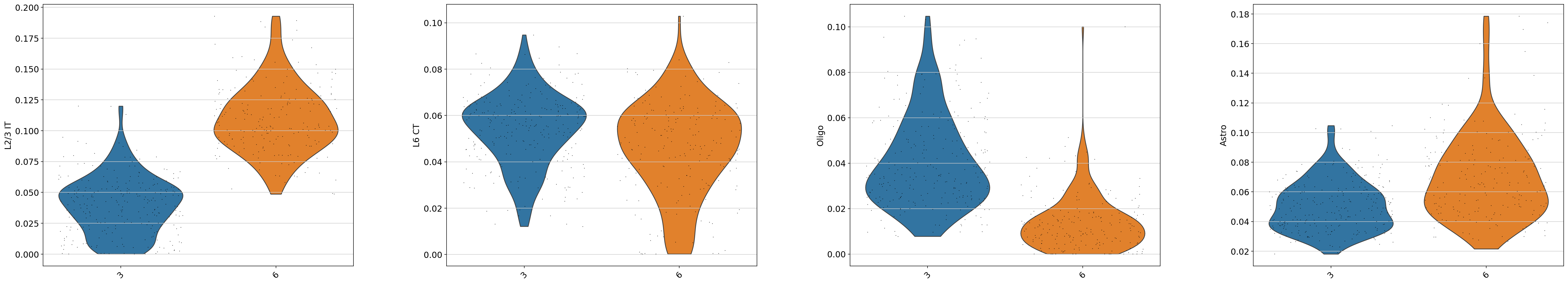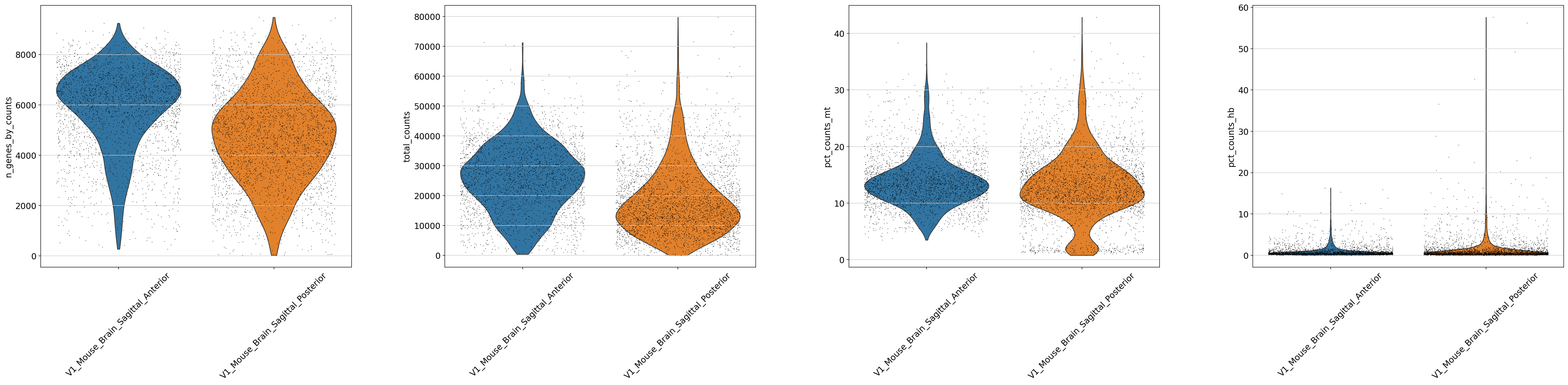 sc.pl.violin(adata, ['n_genes_by_counts', 'total_counts', 'pct_counts_mt', 'pct_counts_hb'], jitter=0.4, groupby = 'library_id', rotation= 45)We can also plot the same data onto the tissue section.
