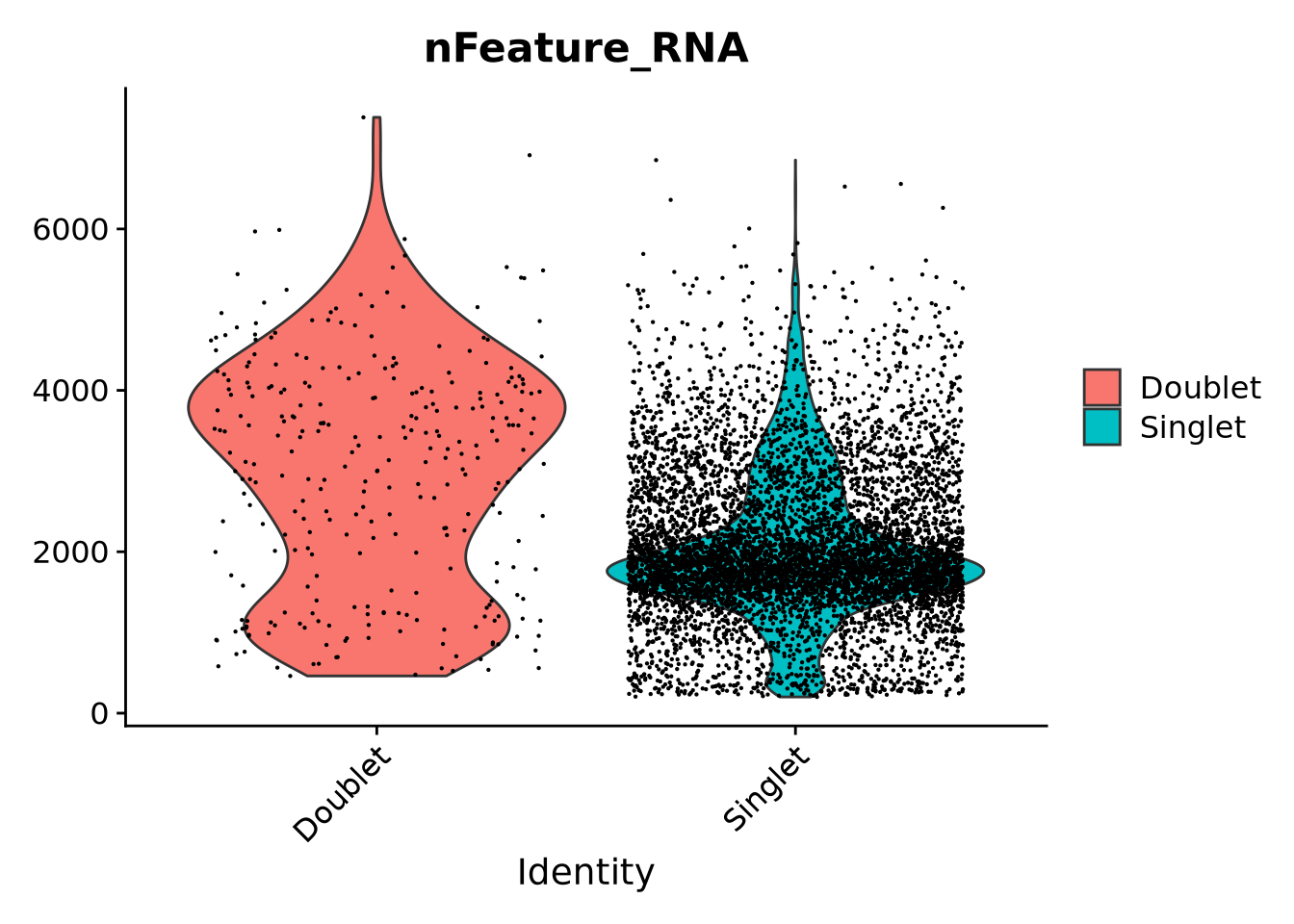 )We should expect that two cells have more detected genes than a single cell, lets check if our predicted doublets also have more detected genes in general.