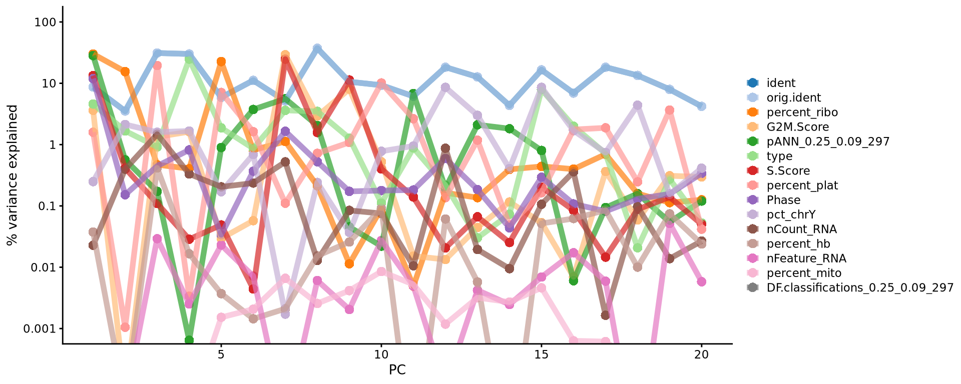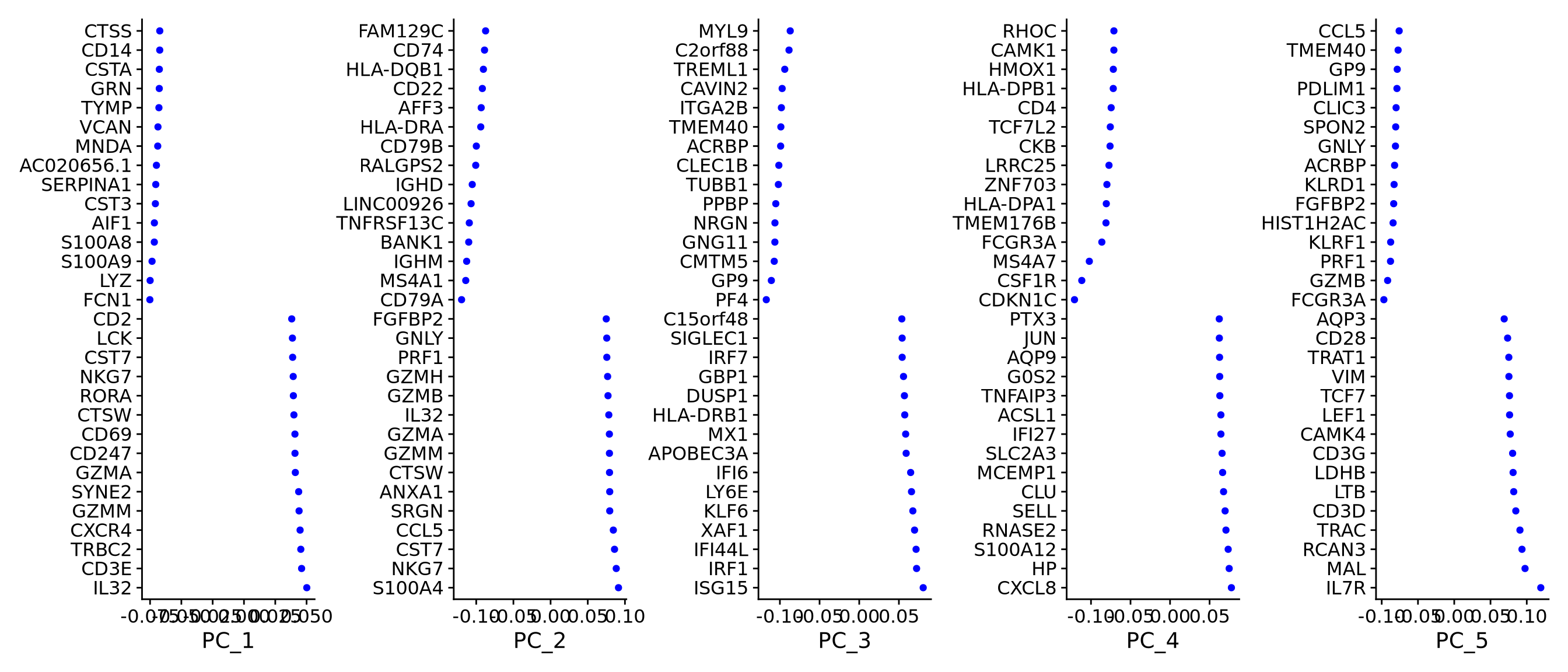 Based on this plot, we can see that the top 8 PCs retain a lot of information, while other PCs contain progressively less. However, it is still advisable to use more PCs since they might contain information about rare cell types (such as platelets and DCs in this dataset)