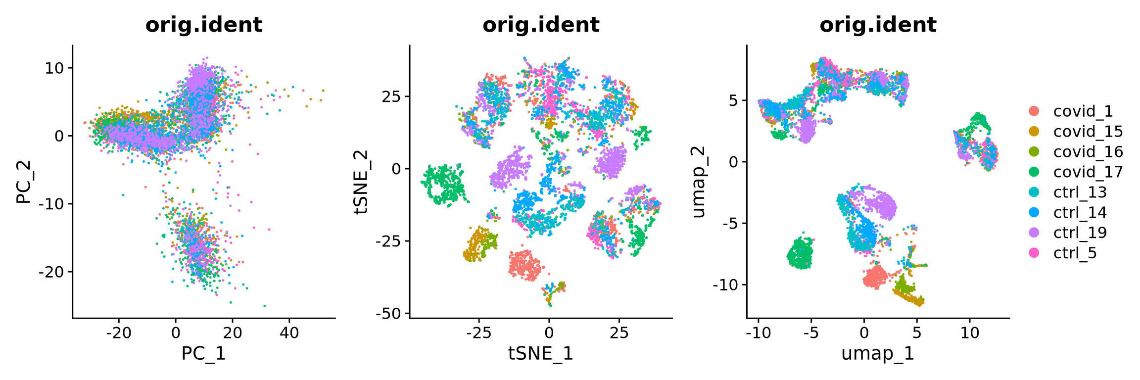 ) + plot_layout(guides = "collect")We can now plot PCA, UMAP and tSNE side by side for comparison. Have a look at the UMAP and tSNE. What similarities/differences do you see? Can you explain the differences based on what you learned during the lecture? Also, we can conclude from the dimensionality reductions that our dataset contains a batch effect that needs to be corrected before proceeding to clustering and differential gene expression analysis.
