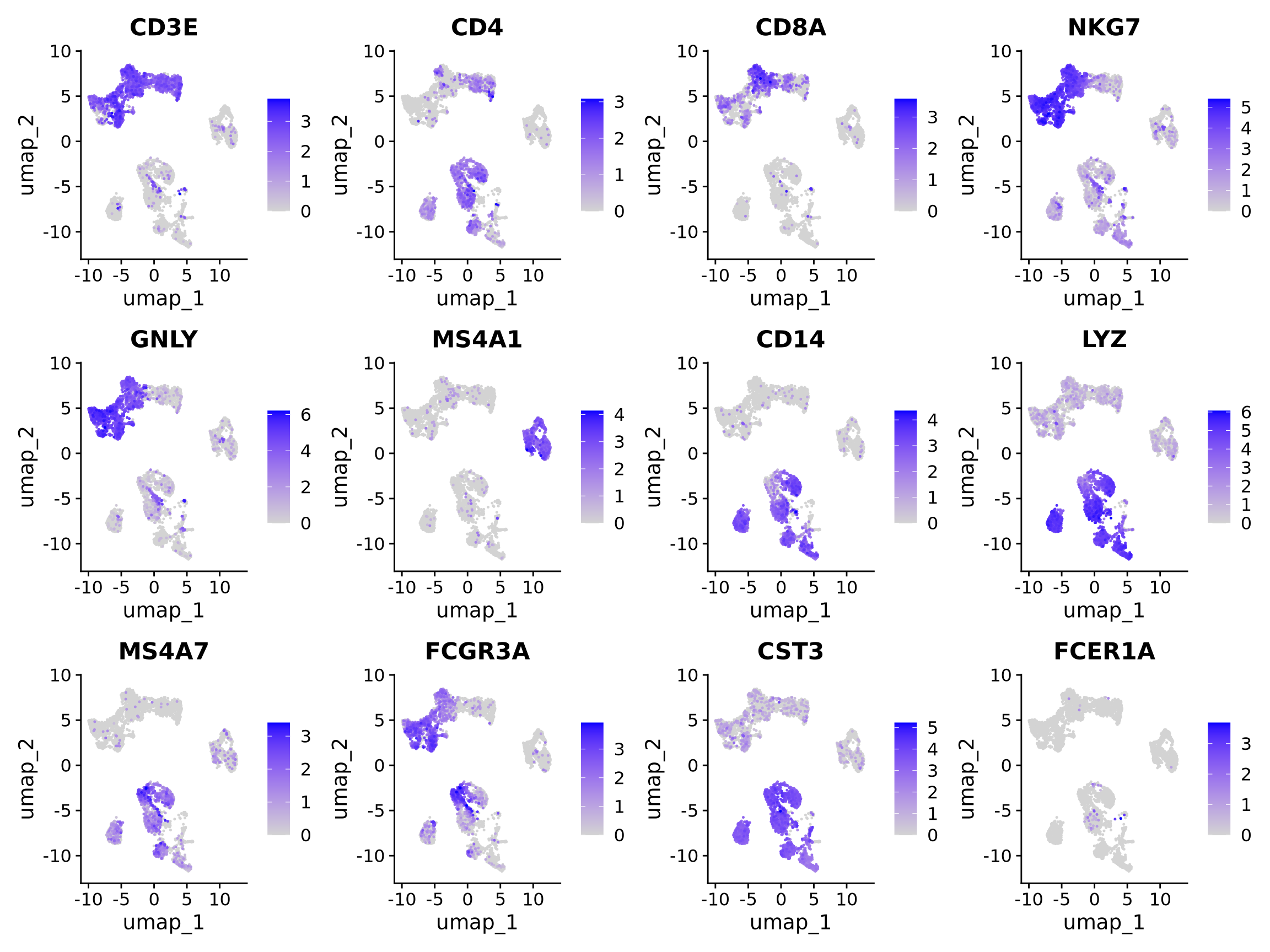 Let’s plot some marker genes for different cell types onto the embedding.