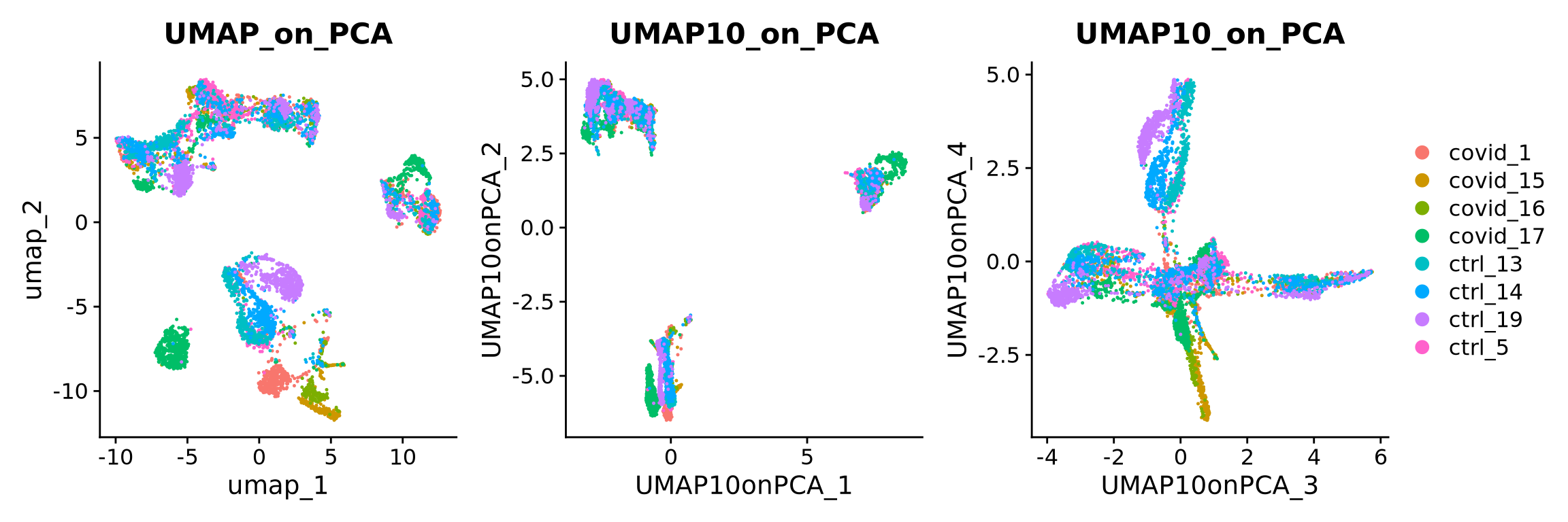 DimPlot(alldata, reduction = "UMAP10_on_PCA", group.by = "orig.ident", dims = 3:4) + ggplot2::ggtitle(label = "UMAP10_on_PCA"),