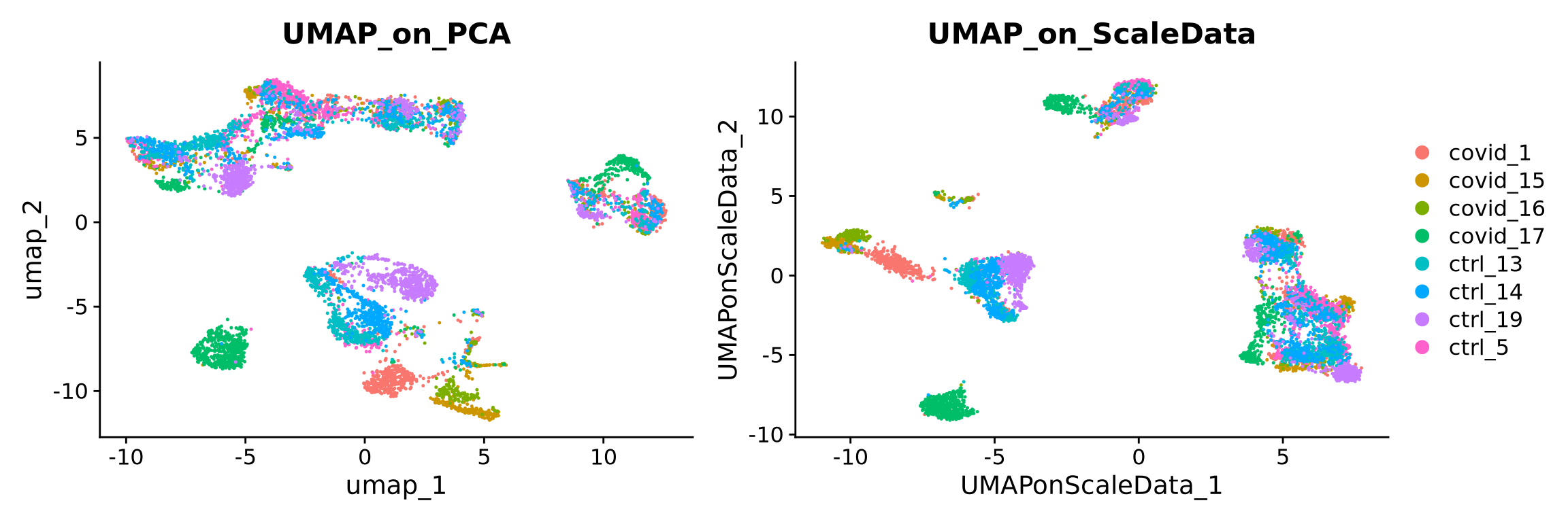 DimPlot(alldata, reduction = "UMAP10_on_PCA", group.by = "orig.ident", dims = 1:2) + ggplot2::ggtitle(label = "UMAP10_on_PCA"),