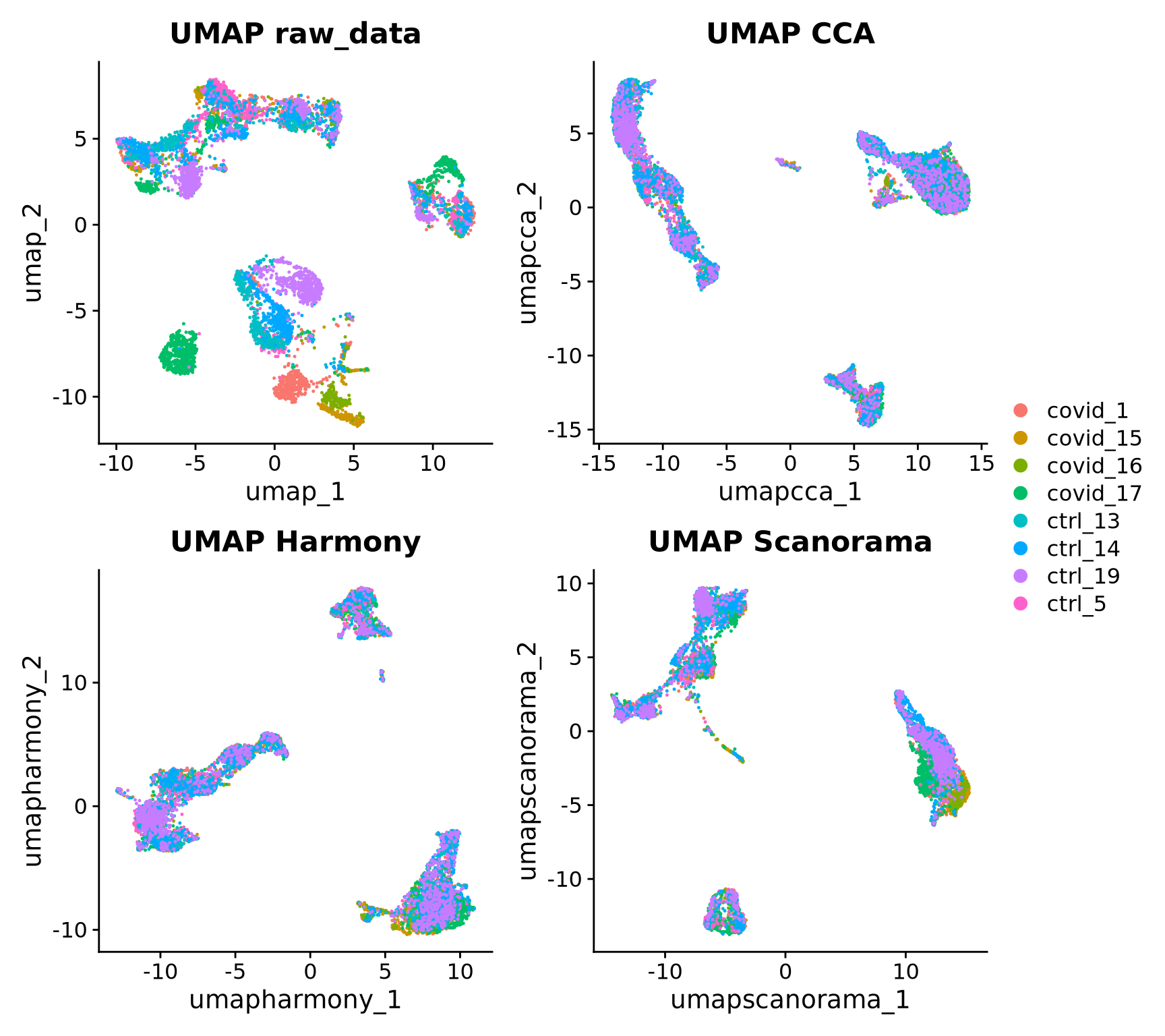 p4 <- DimPlot(alldata, reduction = "umap_scanorama", group.by = "orig.ident")+ggtitle("UMAP Scanorama")