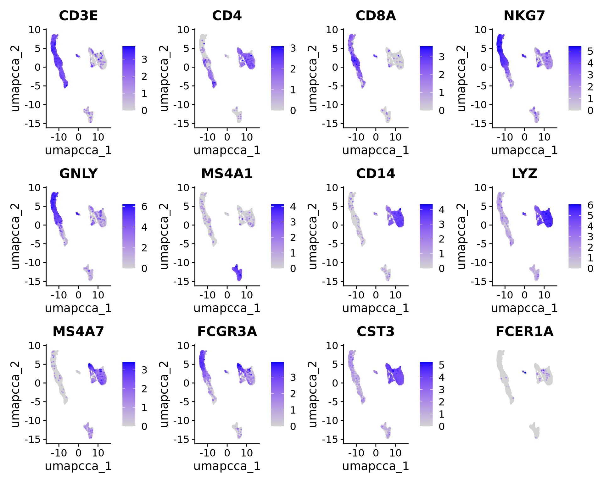 | CD14, LYZ, CST3, MS4A7 | CD14+ Monocytes |