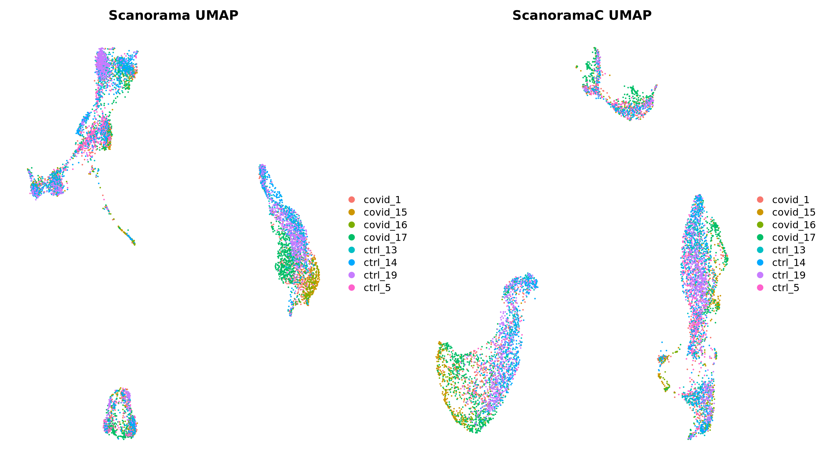 p2 = DimPlot(alldata, reduction = "umap_scanoramaC", group.by = "orig.ident") + NoAxes() + ggtitle("ScanoramaC UMAP")