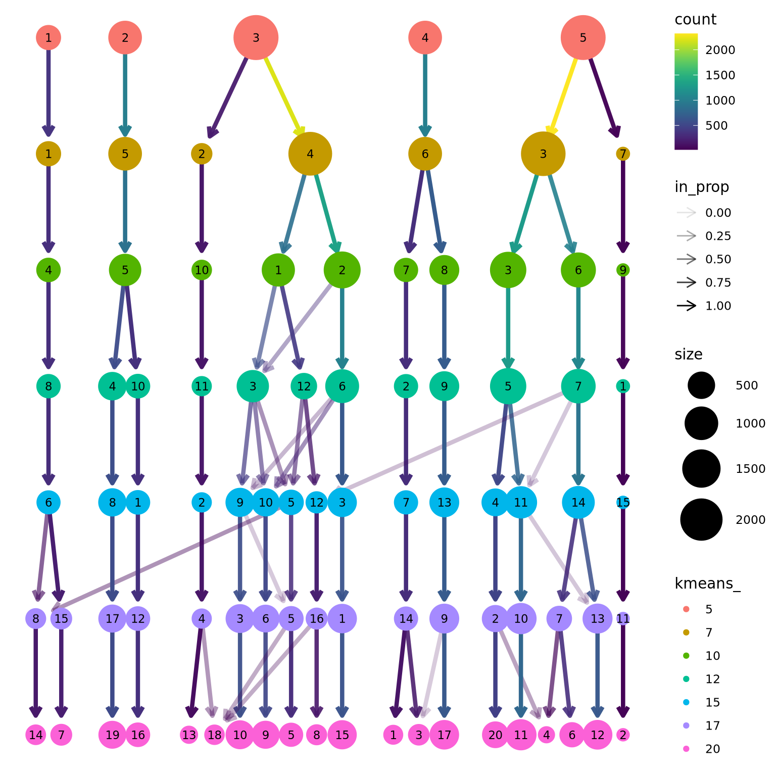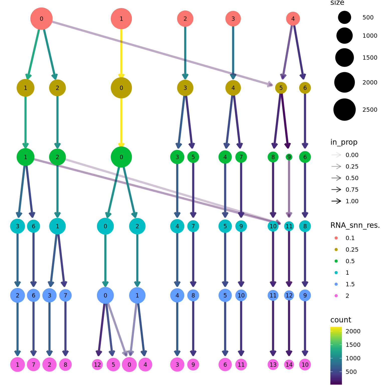 )We can now use the clustree package to visualize how cells are distributed between clusters depending on resolution.