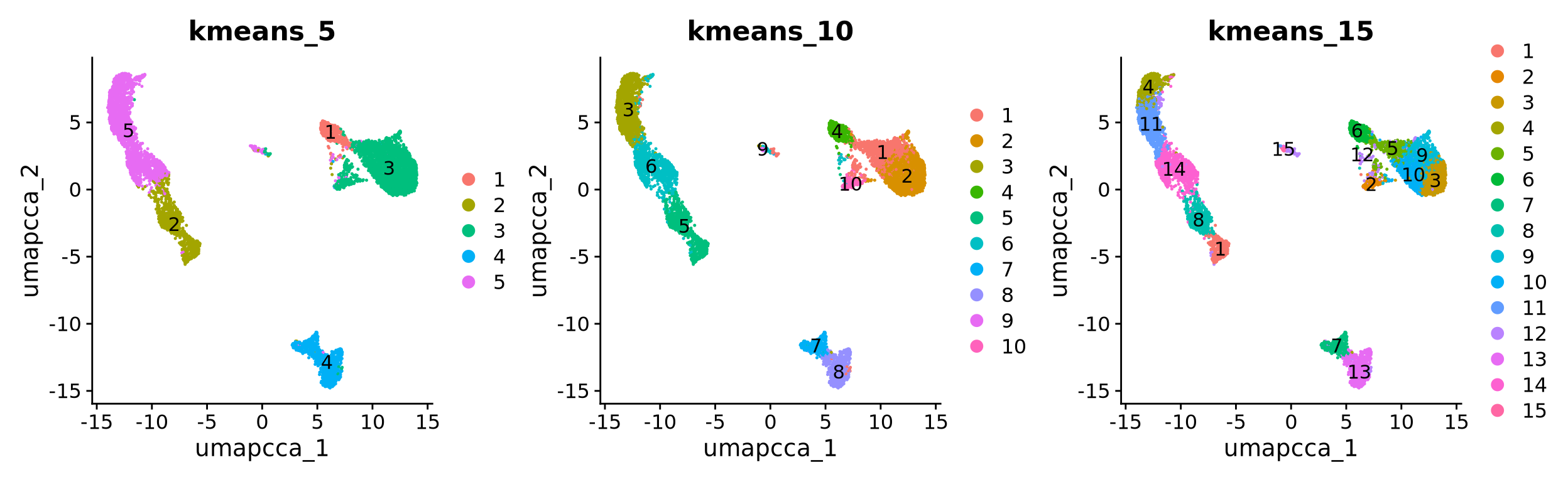 alldata@meta.data[, paste0("kmeans_", k)] <- kmeans(x = Embeddings(alldata, "integrated_cca"), centers = k, nstart = 100)$cluster