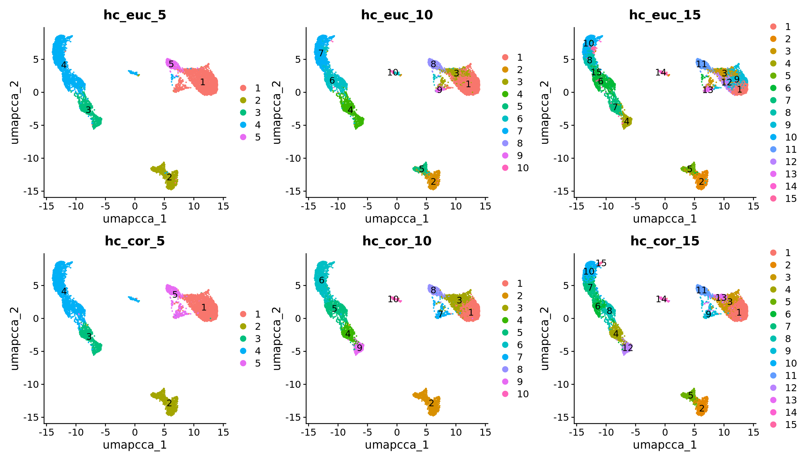 DimPlot(alldata, reduction = "umap_cca", group.by = "hc_euclidean_5", label=T) + ggtitle("hc_euc_5"),