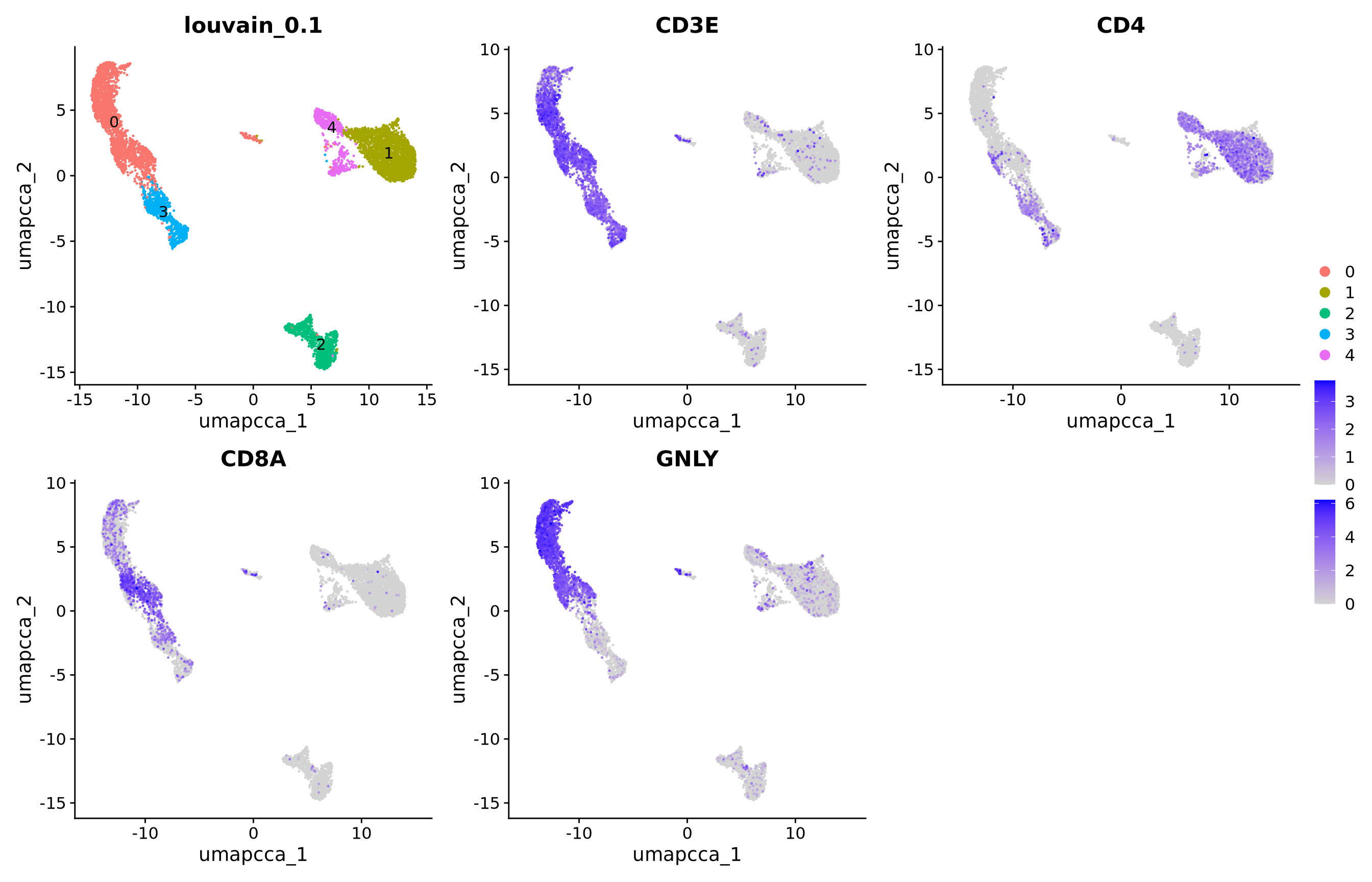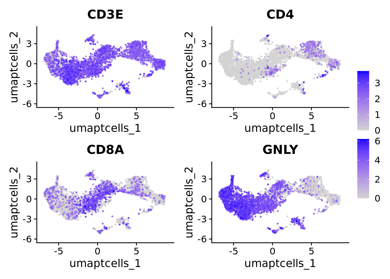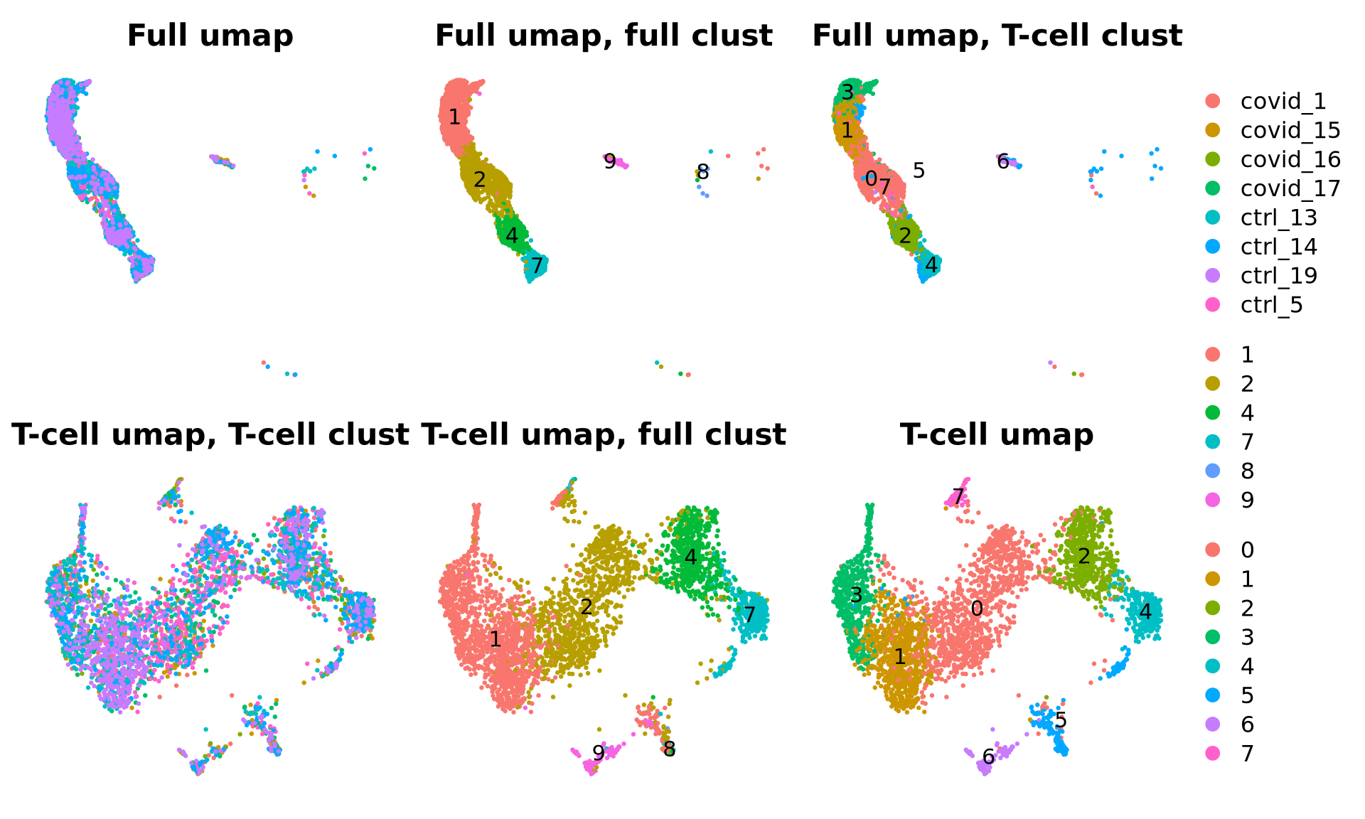 ) + plot_layout(guides = "collect")Have a look at the T-cells in the umaps with all cells or only T/NK cells. What are the main differences? Do you think it improved with subclustering? Also, there are some cells in these clusters that fall far away from the rest in the UMAPs, why do you think that is?