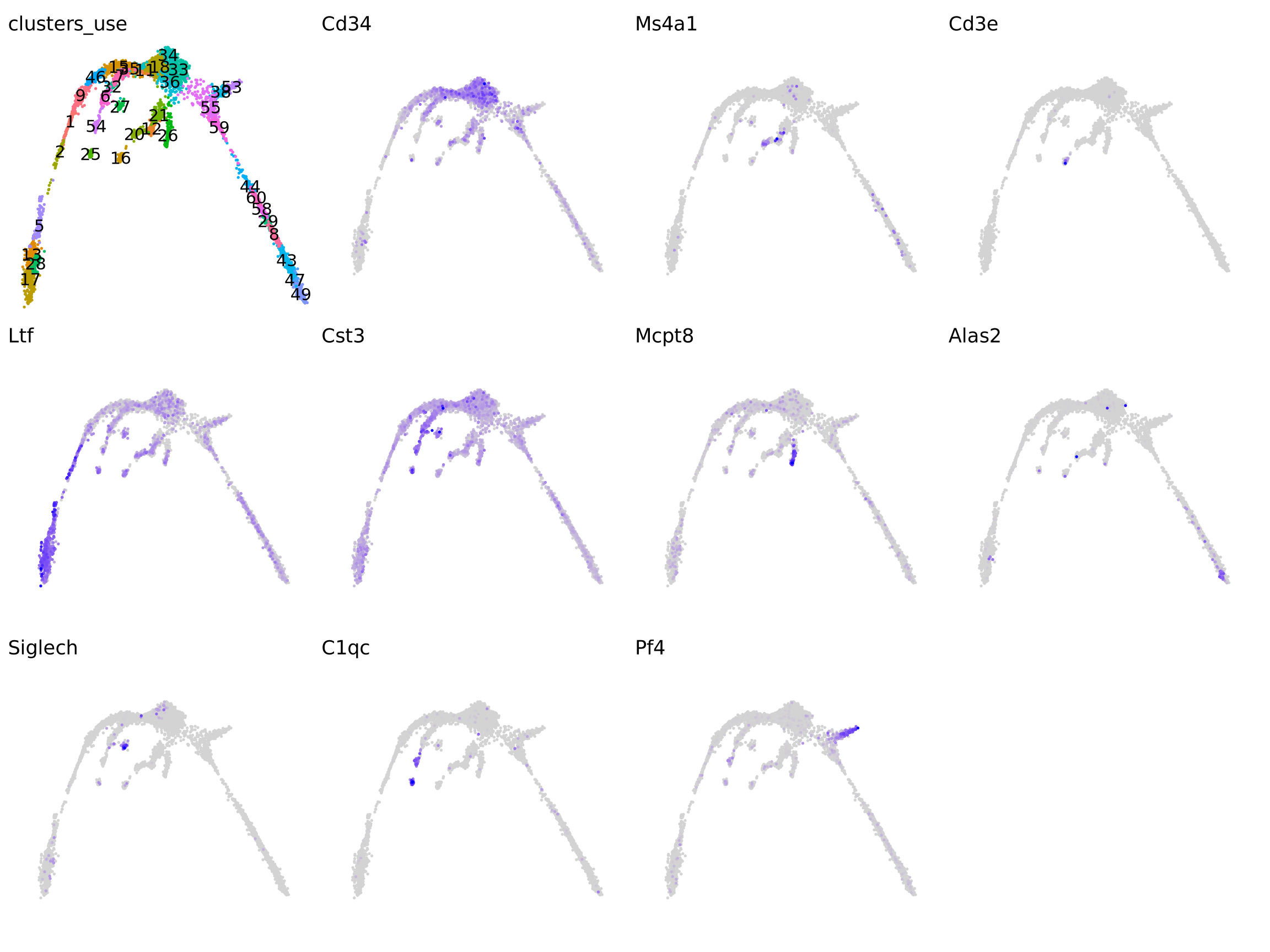 vars <- c("Cd34", "Ms4a1", "Cd3e", "Ltf", "Cst3", "Mcpt8", "Alas2", "Siglech", "C1qc", "Pf4")