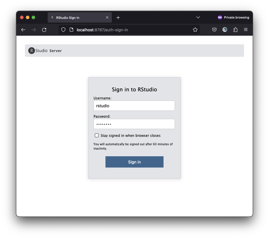 Do not close the terminal. In the browser, go to localhost:8789. Use the following credentials to log in to the RStudio Server: