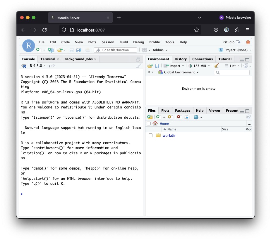 docker run --platform=linux/amd64 --rm -p 8788:8787 -e PASSWORD=scrnaseq -v ${PWD}:/home/rstudio/workdir ghcr.io/nbisweden/workshop-scrnaseq:2024-seurat_spatial-r4.3.0