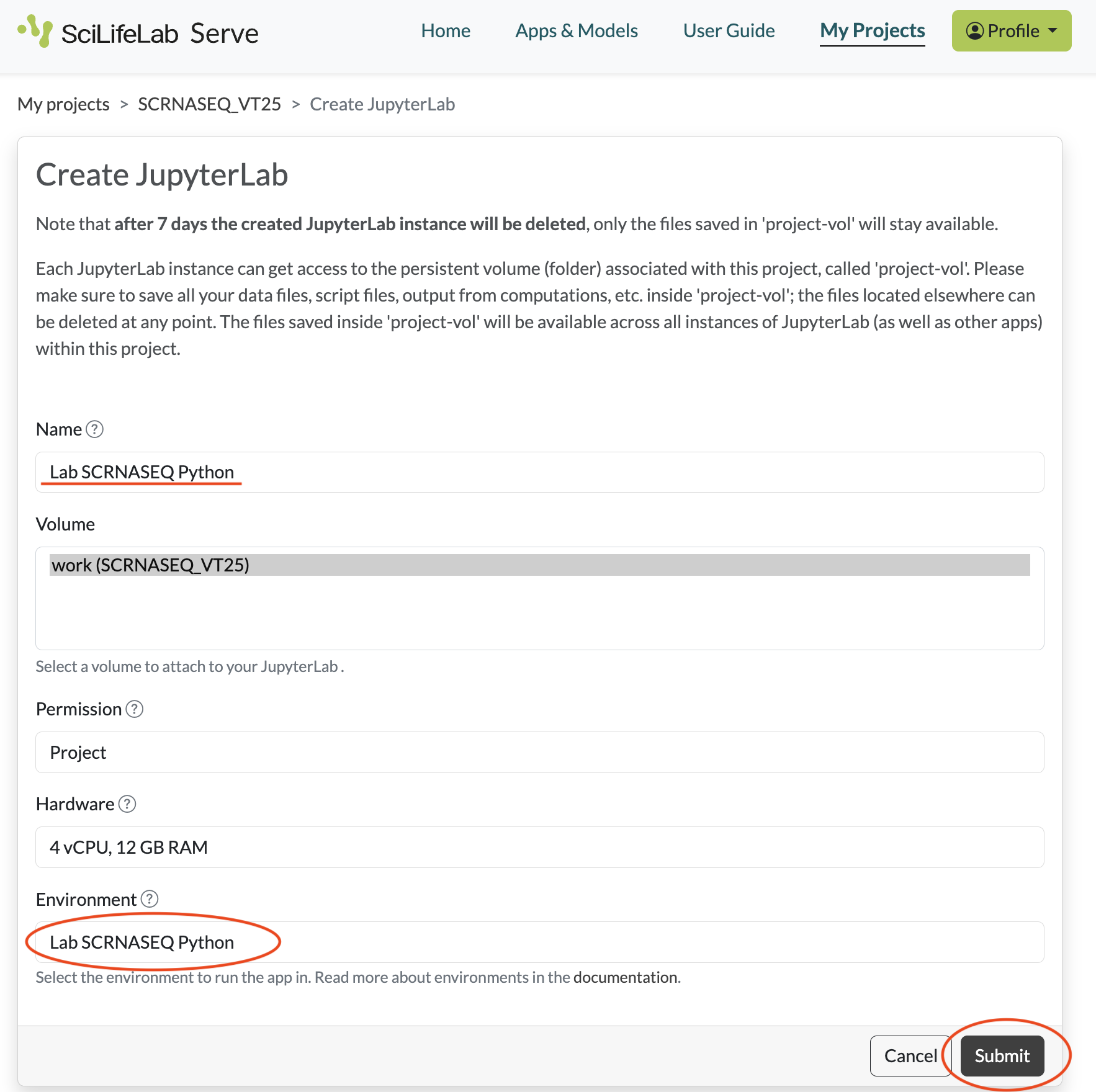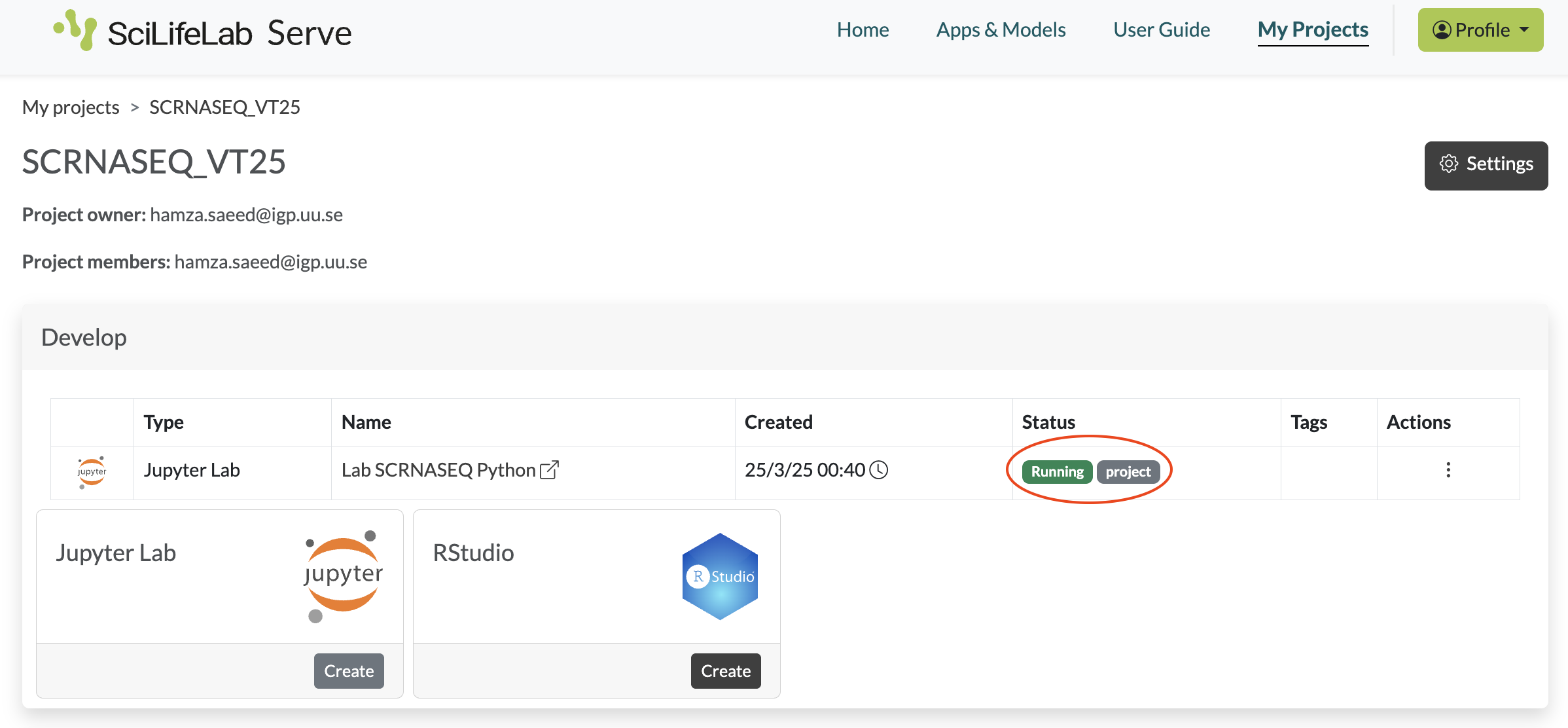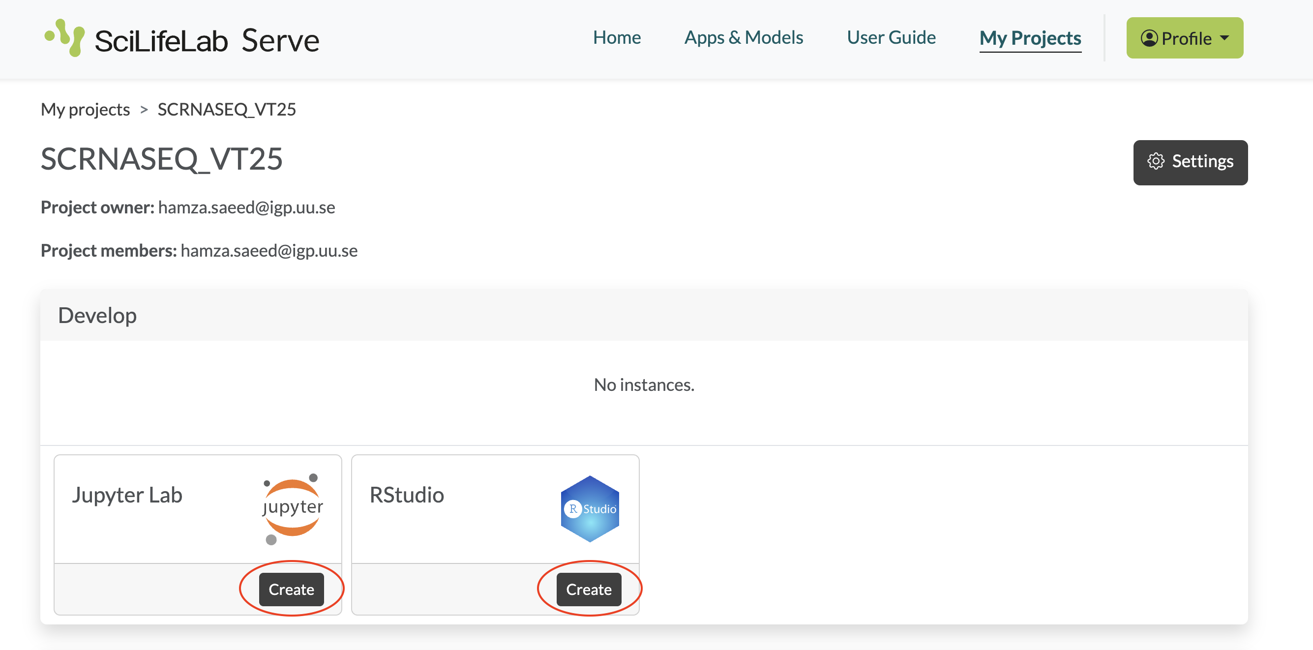 - In the SCRNASEQ_VT25 project, you can create an RStudio (for Seurat/Bioconductor) or JupyterLab (for Scanpy) notebook server instance, depending on which toolkit you choose to work with, by clicking the Create button.